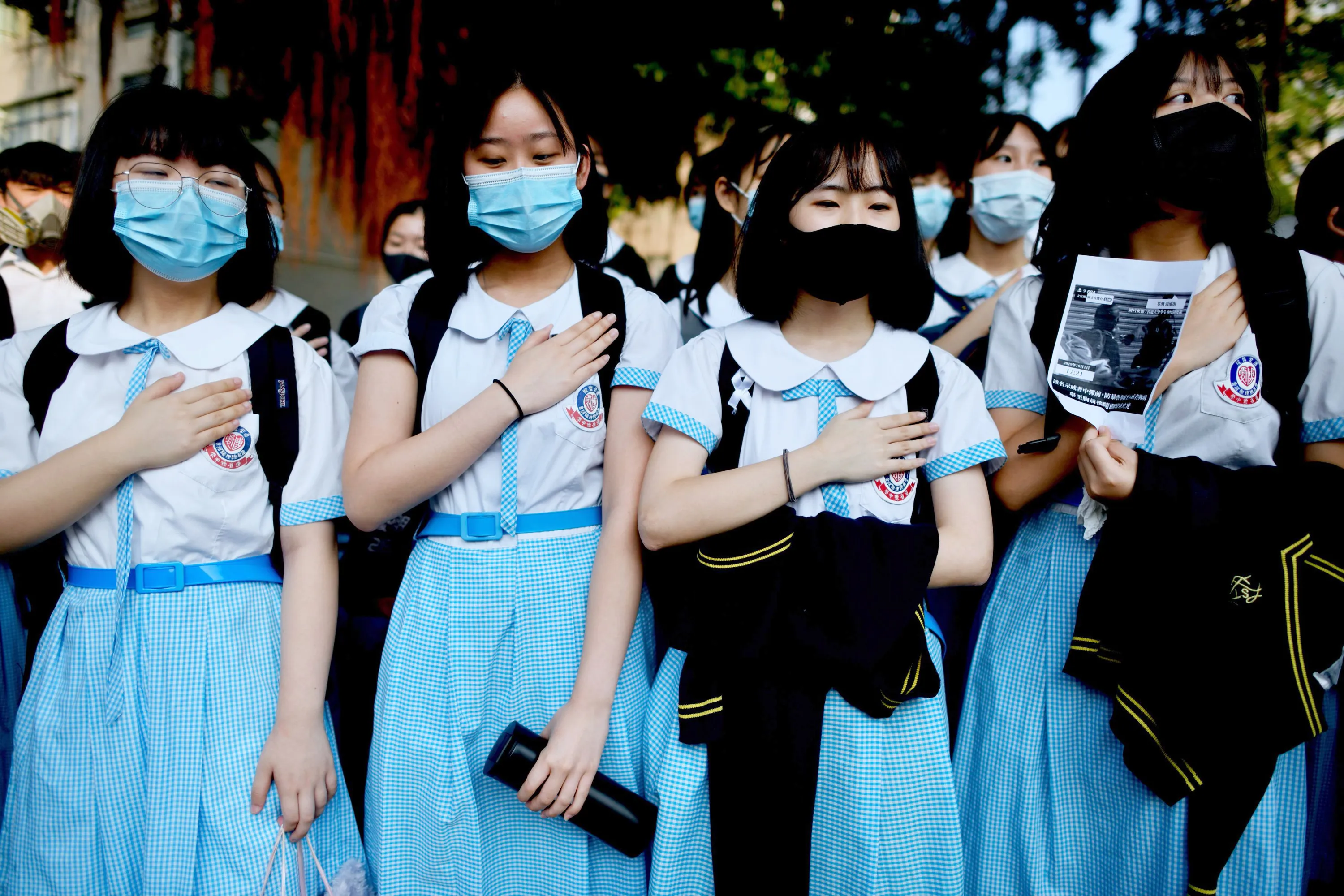 Schoolmates of form five student Tsang Chi-kin, 18, who was shot in the chest by police during violent pro-democracy protests that coincided with China's October 1 National Day, place their hands on their chests during a protest at a school in Hong Kong on October 2, 2019. Hundreds of Hong Kongers staged a sit-in on October 2 outside the school of a protester who was shot by police as authorities said the wounded 18-year-old was now in a stable condition. (Photo by Mohd Rasfan/AFP Photo)