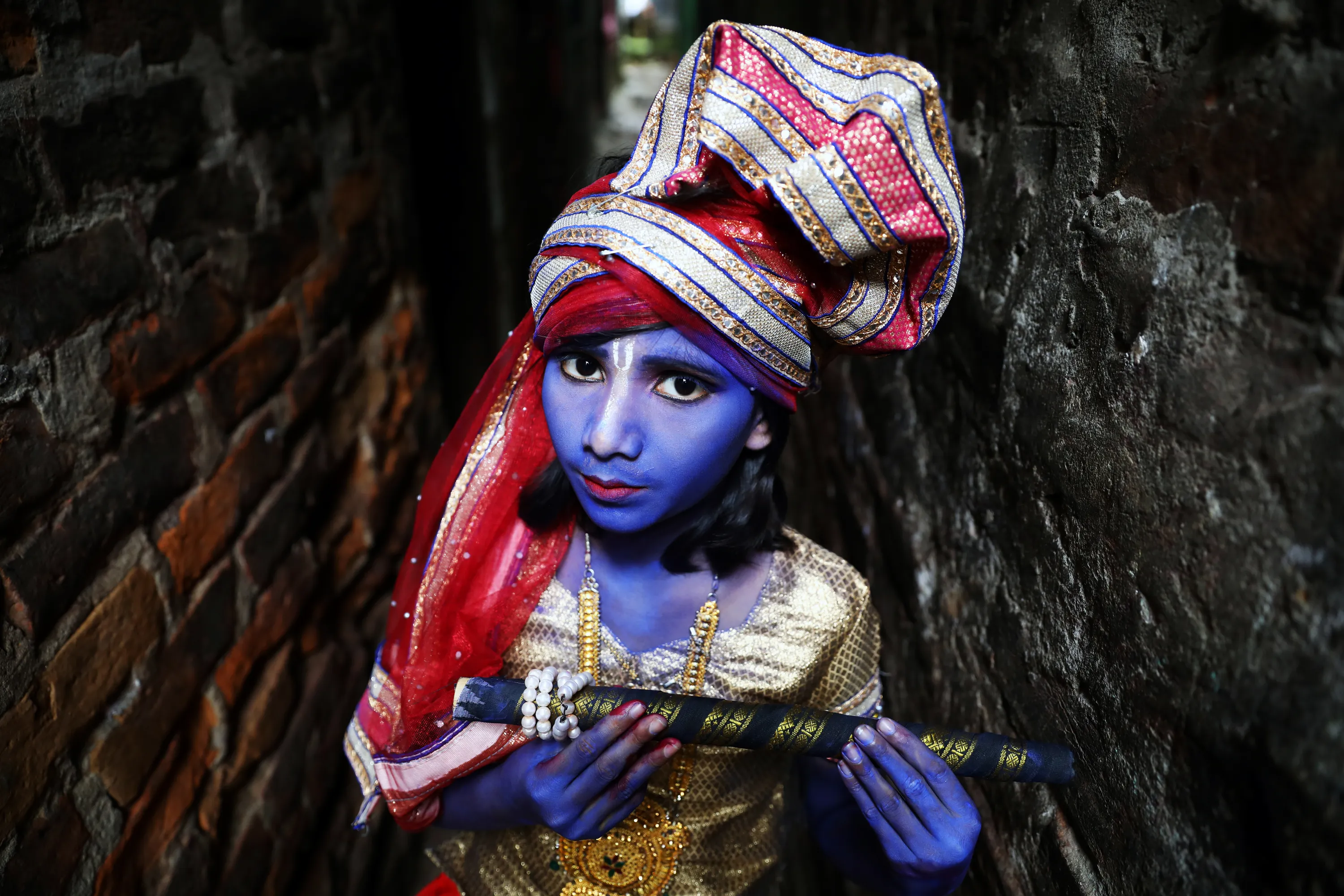 A child dressed as Hindu Lord Krishna poses during the festival of Janmashtami, marking the birth of Hindu Lord Krishna, in Dhaka, Bangladesh, August 23, 2019. (Photo by Mohammad Ponir Hossain/Reuters)