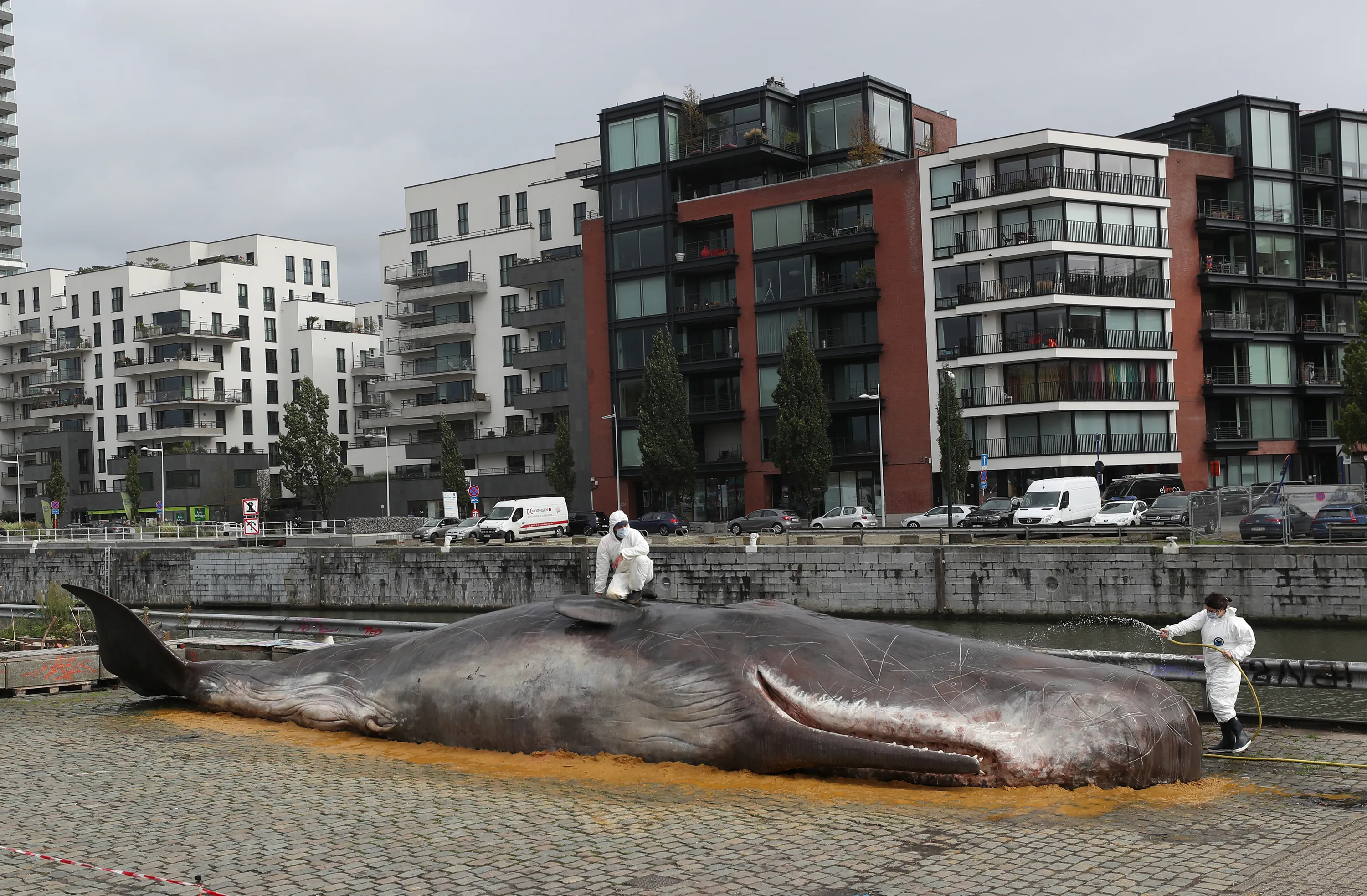 A hyper-realistic whale model is seen near the canal as part of an artistic presentation by the Belgian collective Whale marking the launch of the “Nuit Blanche” festival in Brussels, Belgium on October 4, 2019. (Photo by Yves Herman/Reuters)