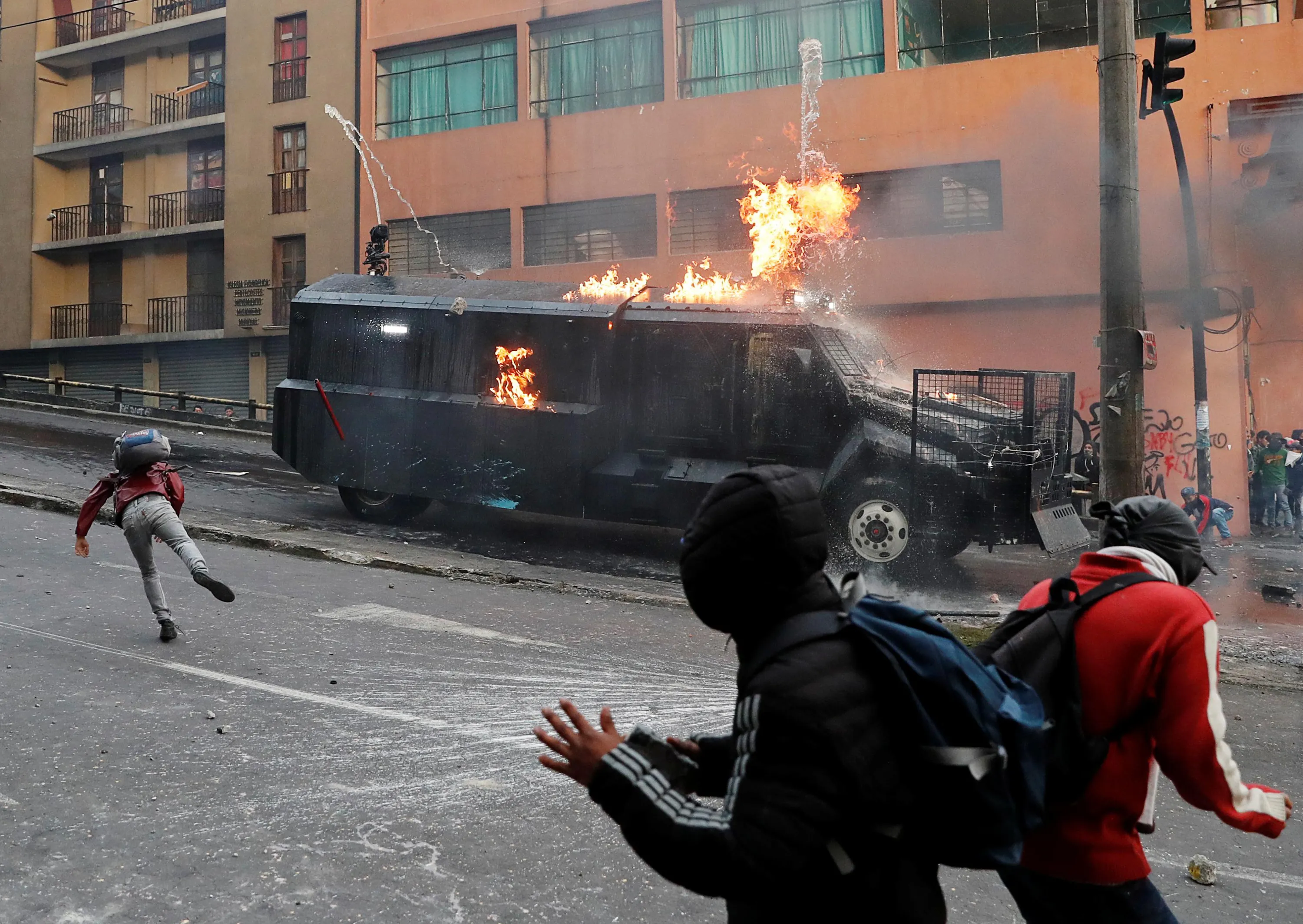 A police vehicle burns during a protest against Ecuador's President Lenin Moreno's austerity measures in Quito, Ecuador, October 7, 2019. Ecuadorean protesters have clashed with security forces and blocked highways for five days to demonstrate against government austerity measures, including the end of four-decade-old fuel subsidies. (Photo by Carlos Garcia Rawlins/Reuters)