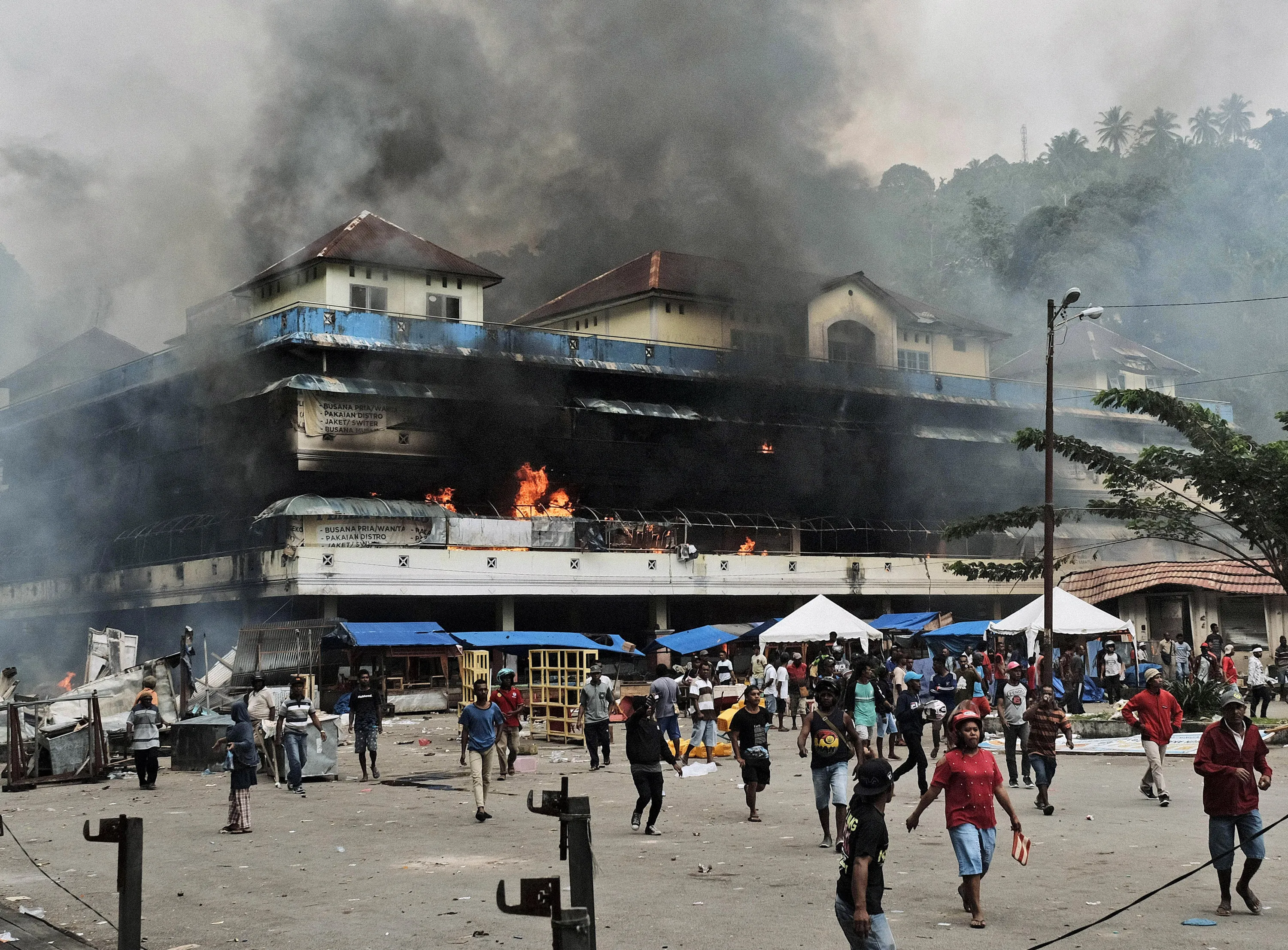 Local market is seen burning during a protest in Fakfak, Papua province, Wednesday, August 21, 2019. Indonesia has deployed over 1,000 security personnel to the restive province of West Papua amid spreading violent protests sparked by accusations that security forces had arrested and insulted Papuan students in East Java. (Photo by AP Photo/Beawiharta)
