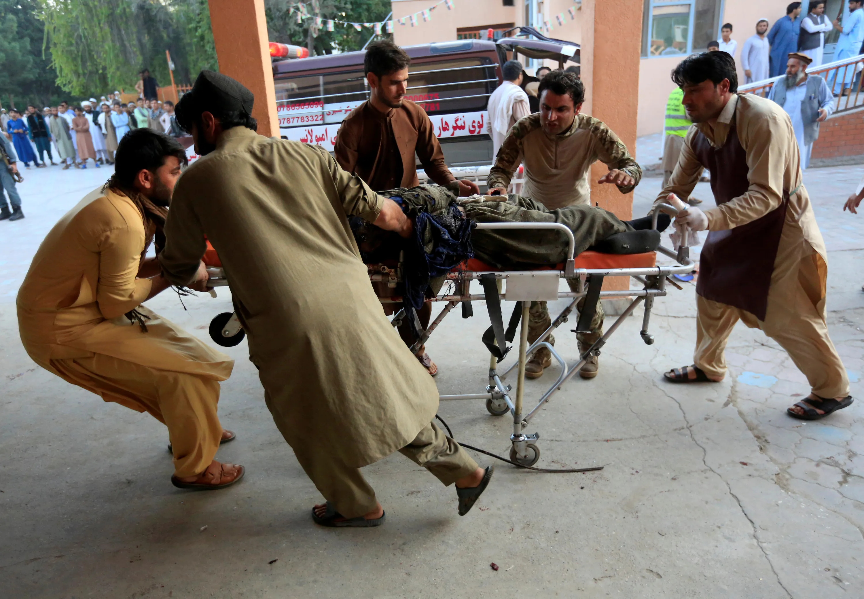 Men carry an injured person to a hospital after a blast in Jalalabad, Afghanistan on October 7, 2019. (Photo by Reuters/Parwiz)