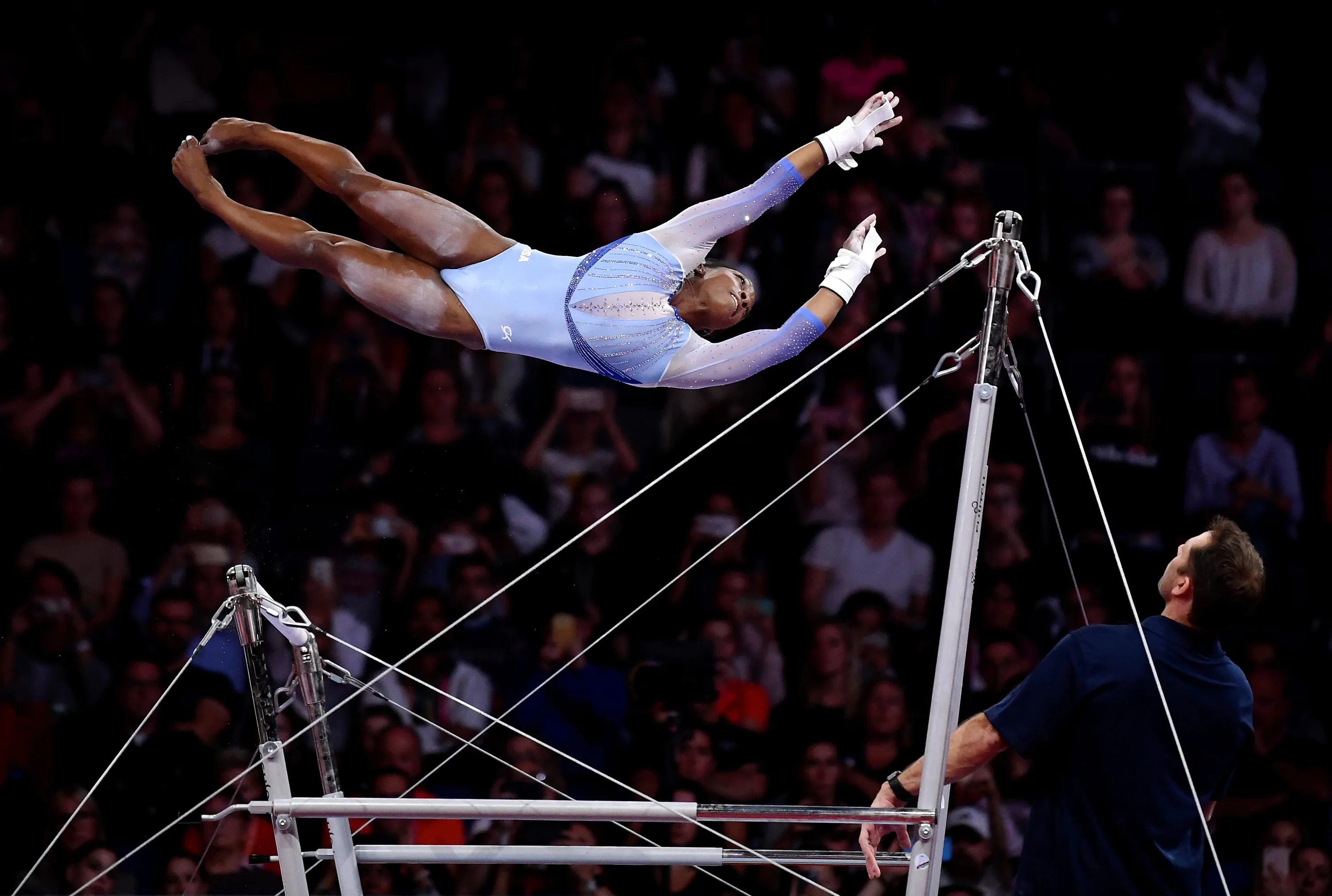 Simone Biles of USA performs on Uneven Bars during Women's Qualification on Day 2 of the FIG Artistic Gymnastics World Championships on October 05, 2019 in Stuttgart, Germany. (Photo by Laurence Griffiths/Getty Images)