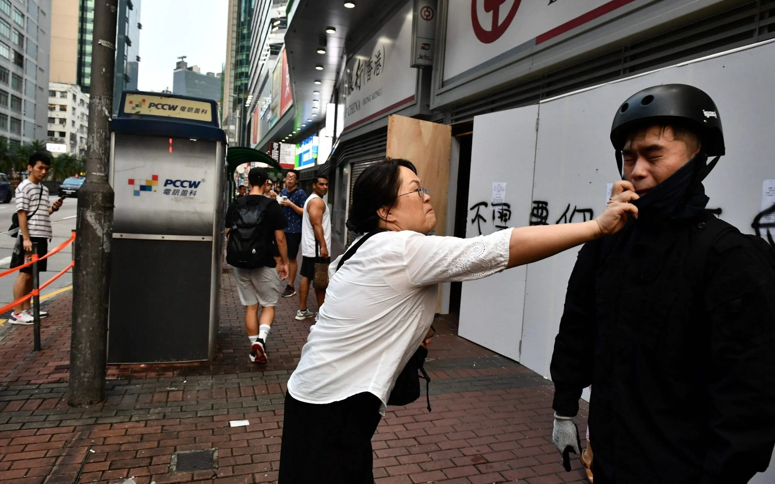 A woman tries to remove a facemask worn by a protesters after an anti-emergency law march from the Tsim Sha Tsui to Sham Shui Po areas of Hong Kong on October 12, 2019. Hong Kong protesters arrested for defying a new face mask ban appeared in court on October 7 following a violent weekend of unrest which saw bloody clashes with police and widespread vandalism that crippled the city's train network. (Photo by Anthony Wallace/AFP Photo)