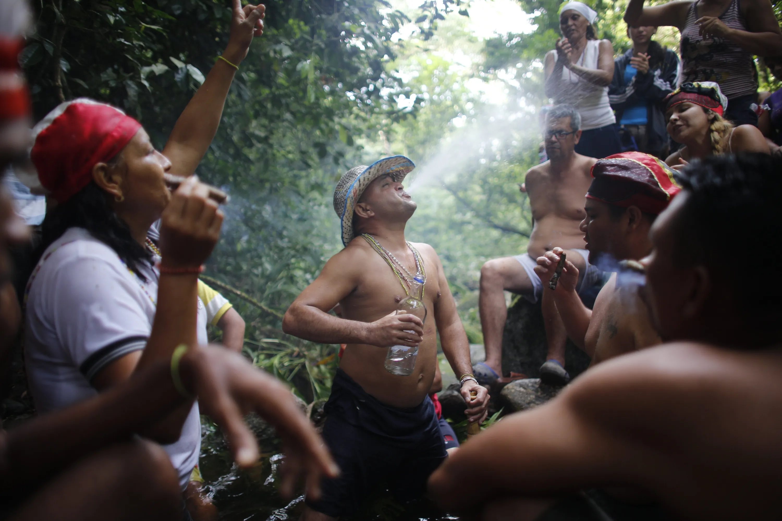 In this photo taken October 12, 2019, Juan Carlos Paso sprays water from his mouth on others during a ceremony on Sorte Mountain where followers of indigenous goddess Maria Lionza gather in Venezuela's Yaracuy state. The cult of the goddess is hundreds of years old and draws on elements of the Afro-Caribbean religion Santeria and indigenous rituals, as well as Catholicism. (Photo by Ariana Cubillos/AP Photo)