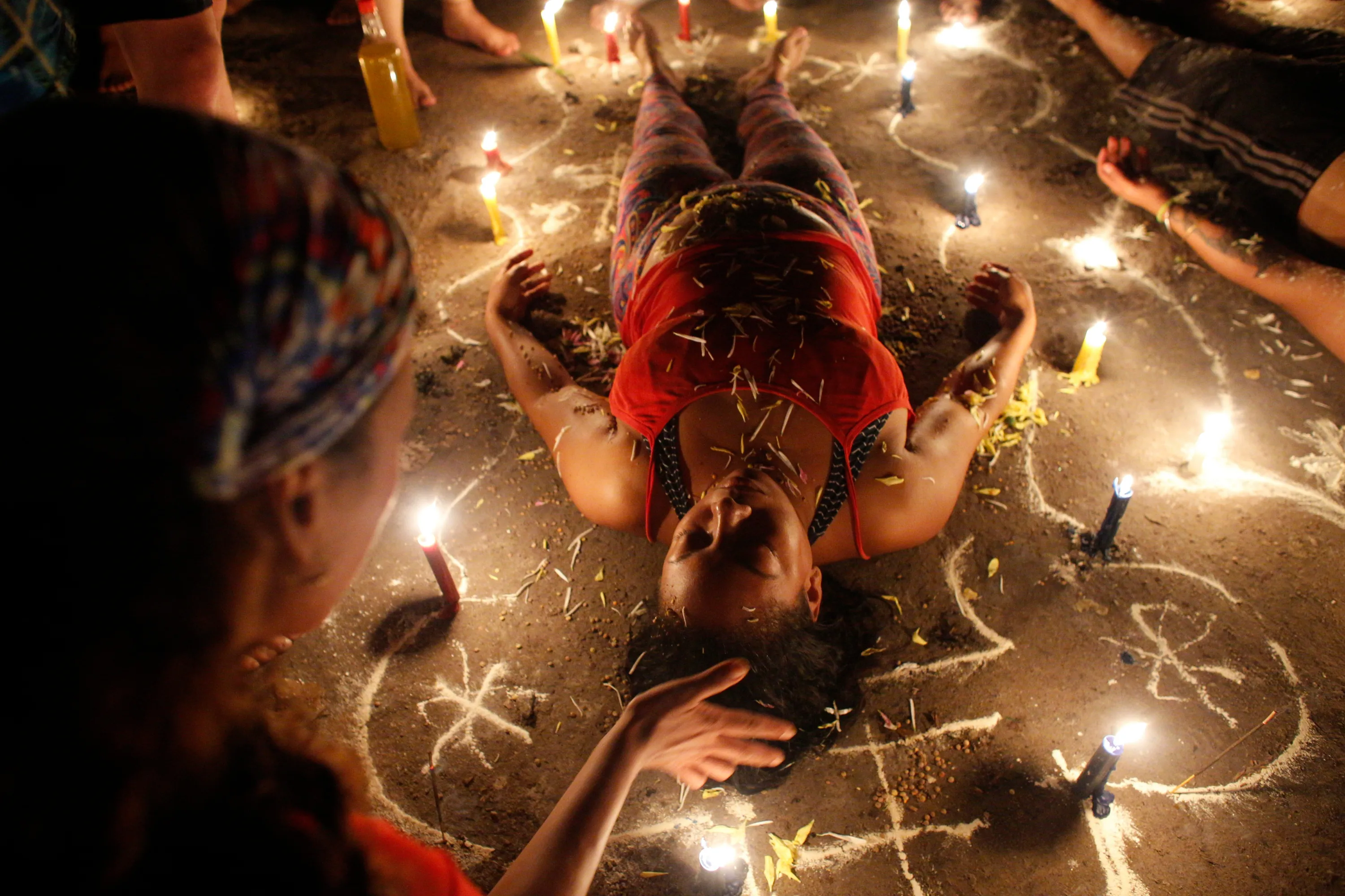 In this photo taken October 11, 2019, a woman surrounded by candles and designs drawn on the ground with white powder lies with her eyes closed during a spiritual ceremony on Sorte Mountain where followers of indigenous goddess Maria Lionza gather annually in Venezuela's Yaracuy state. Believers often ask for spiritual healing or protection from witchcraft, or thank the goddess for curing an illness. (Photo by Ariana Cubillos/AP Photo)