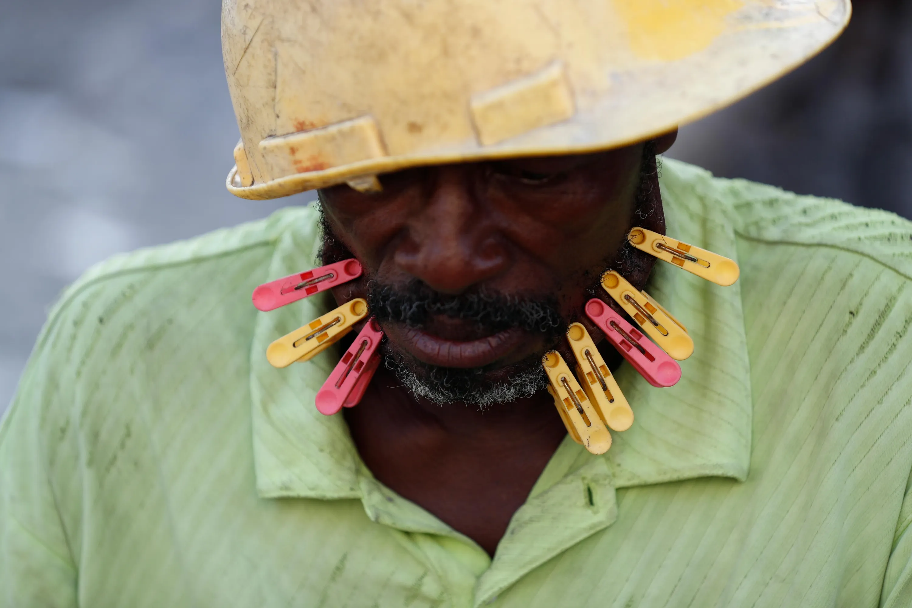 Plastic clothes pins are clipped to the skin of a dominos player, the punishment for losing team, as men compete in the game in Cite Soleil neighborhood of Port-au-Prince, Haiti, Thursday, October 10, 2019. Residents of Cite Soleil say that their already limited access to basic services, work, and security has only been declining, and many are participating in the protests calling for the resignation of President Jovenel Moise. (Photo by Rebecca Blackwell/AP Photo)