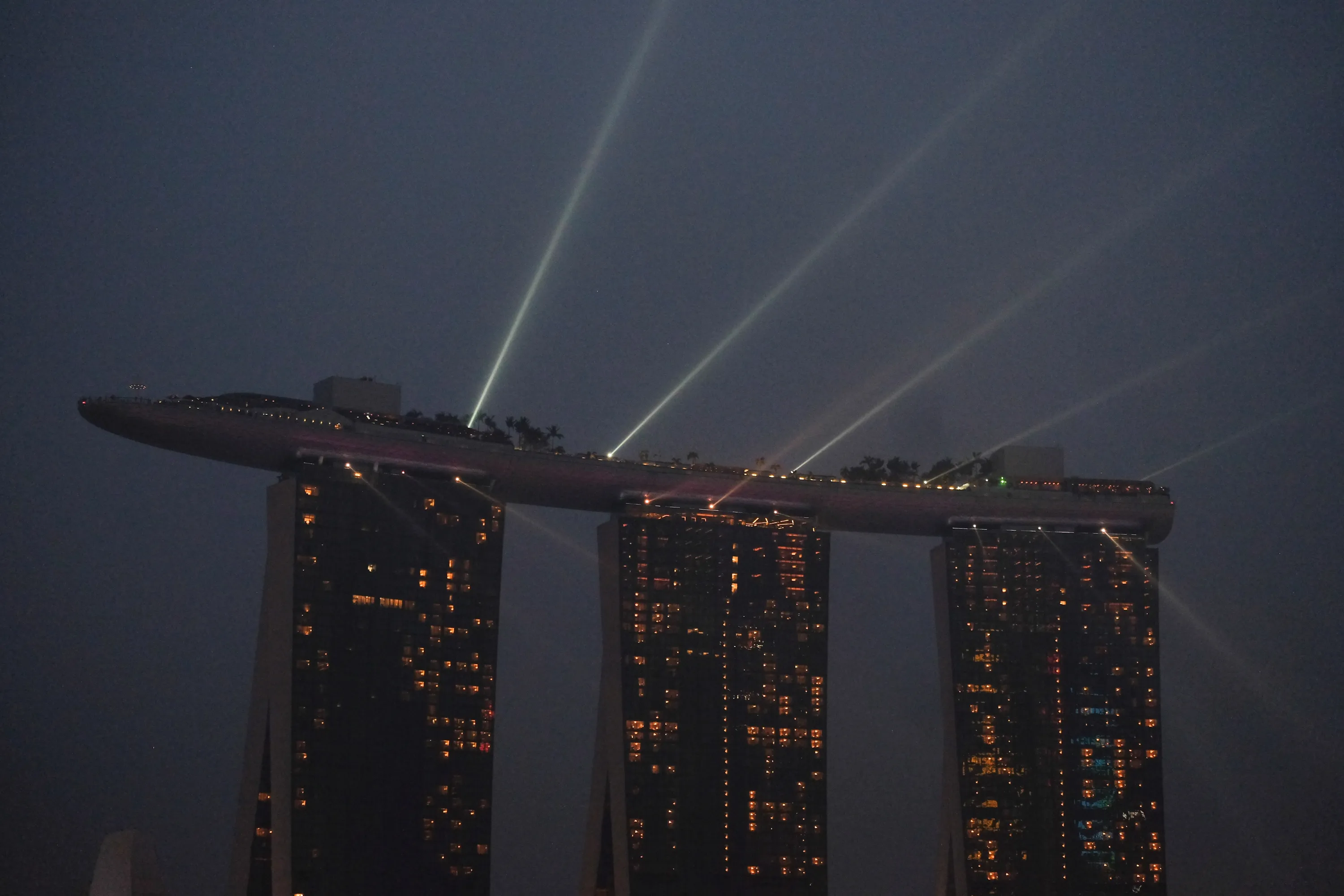 A laser light show plays from the top of the Marina Bay Sands integrated resort during haze in Singapore, September 18, 2019. (Photo by Kevin Lam/Reuters)