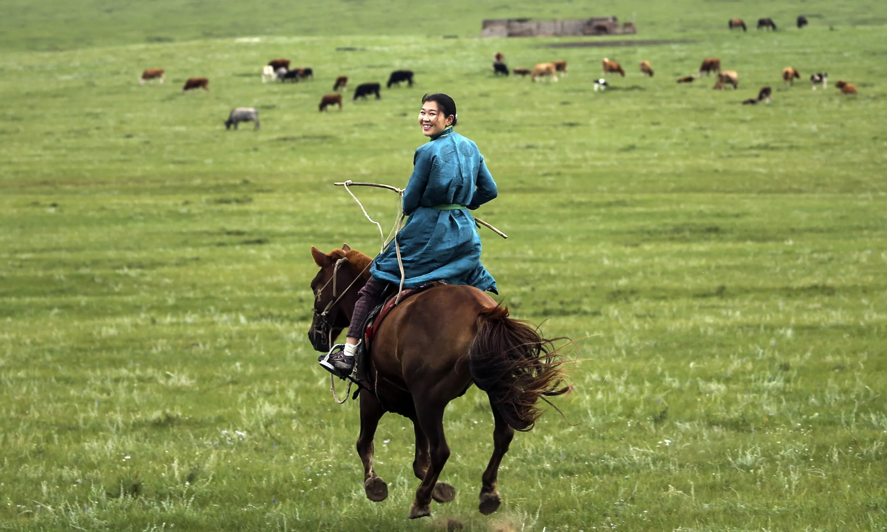 A view of a moorland as a woman riding a horse at Delgerhaan of Khentii, Mongolia on August 18, 2019. In Mongolia, archaeological evidences of horse culture dates back to 3200 years ago. Especially children started to mount horses in vast moorlands at the age of four, maintaining the tradition of horse riding. (Photo by Firat Yurdakul/Anadolu Agency via Getty Images)