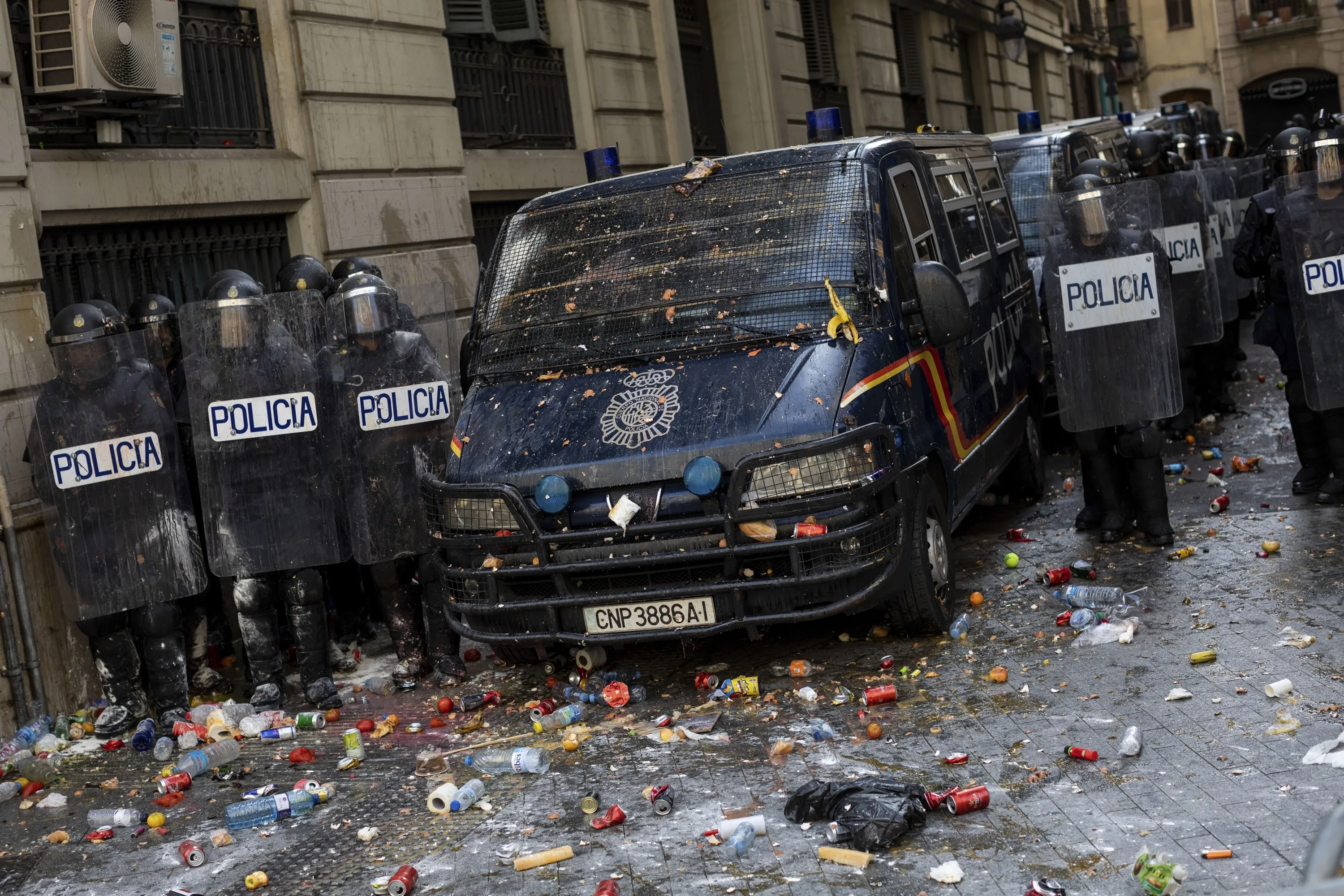 Spanish police stand outside a police station surrounded of objects thrown by pro-independence demonstrators in Barcelona, Spain, Friday, October 18, 2019. Various flights into and out of the region are cancelled Friday due to a general strike called by pro-independence unions and five marches of tens of thousands from inland towns are expected converge in Barcelona's center on Friday afternoon for a mass protest with students to and workers who are on strike. (Photo by Bernat Armangue/AP Photo)