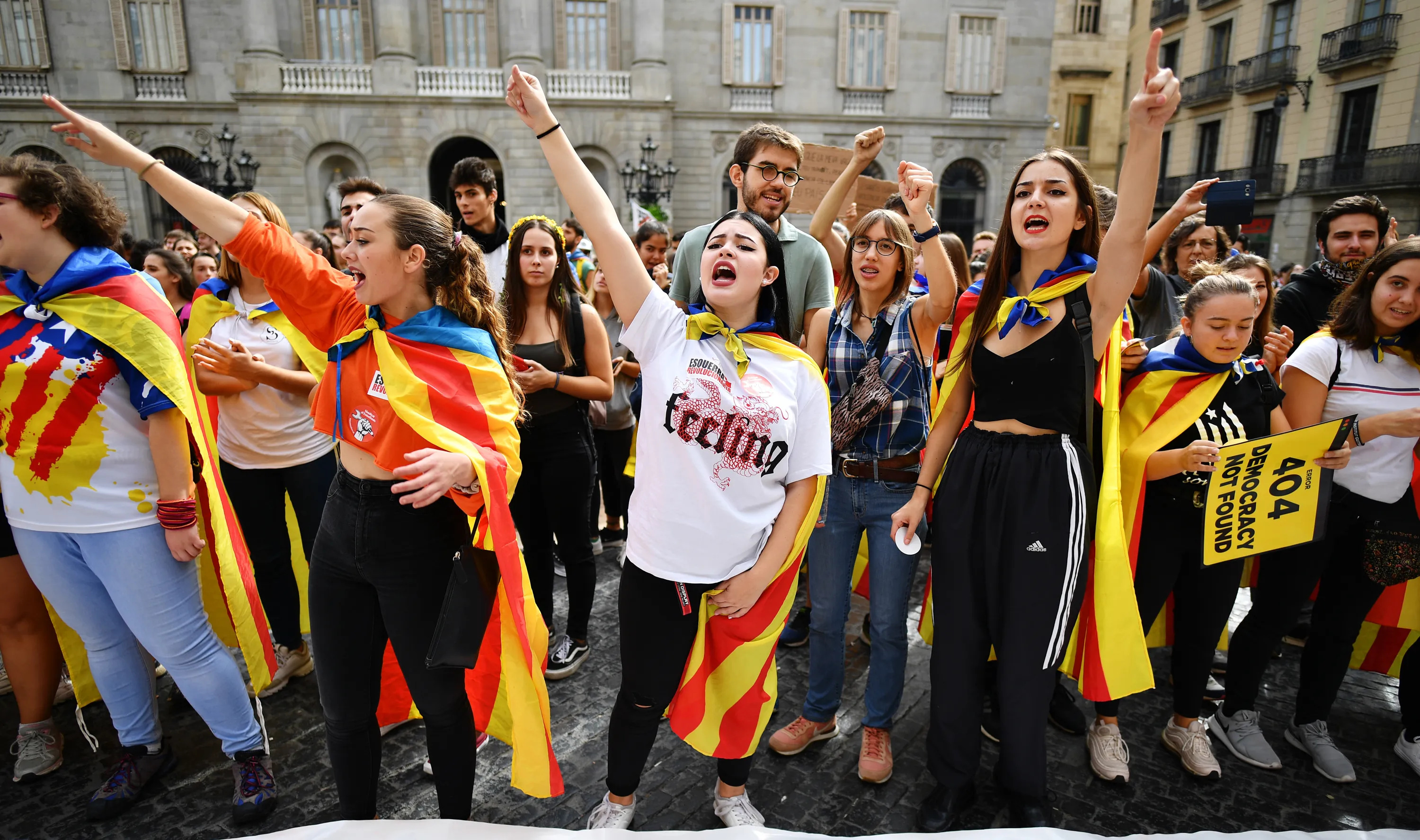 Young demonstrators gather following a week of protests over the jail sentences given to separatist politicians by Spain’s Supreme Court, on October 18, 2019 in Barcelona, Spain. Nine Catalan pro-independence leaders were sentenced earlier this week to varying jail terms for sedition, in relation to the 2017 independence referendum. (Photo by Jeff J. Mitchell/Getty Images)