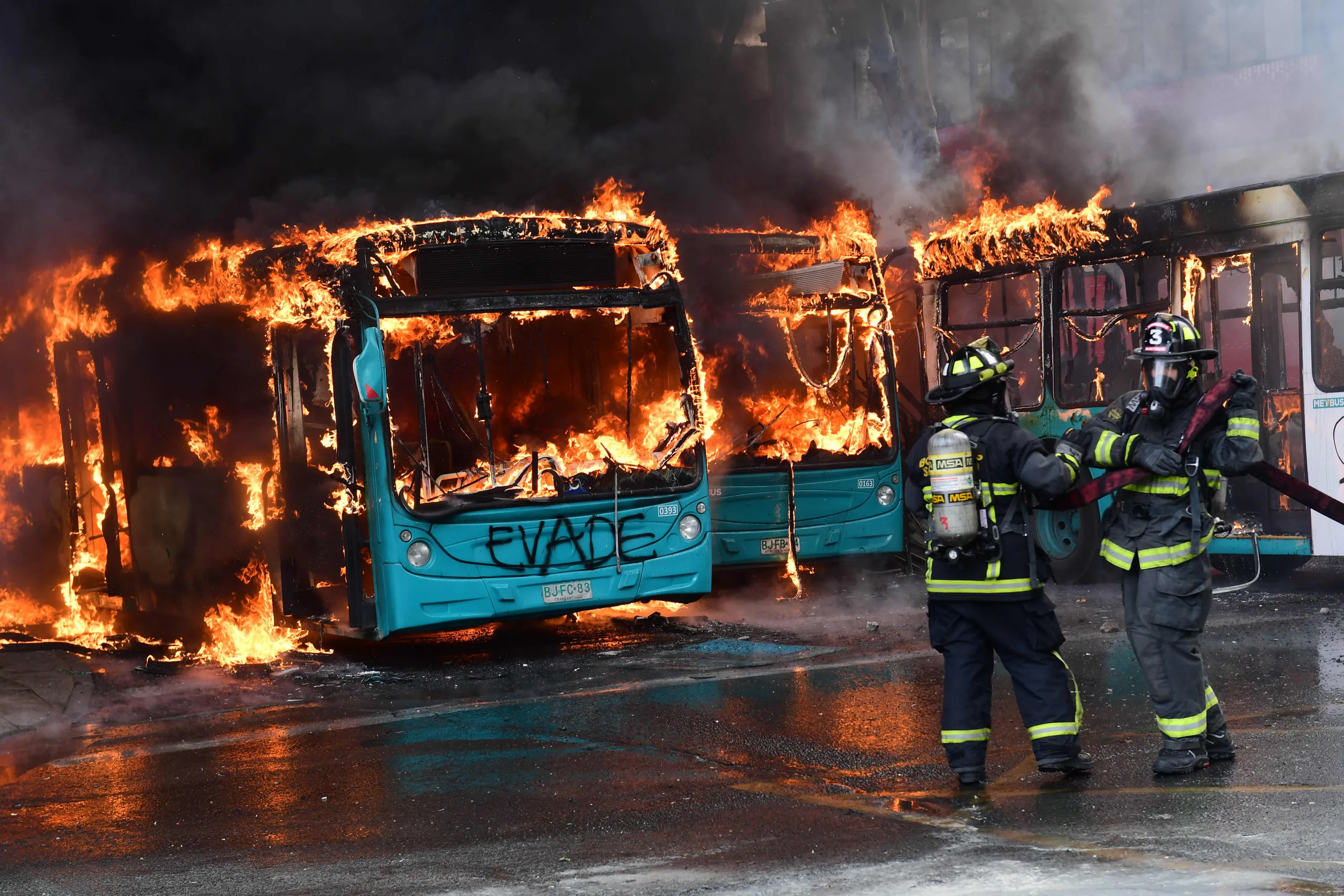 Chilean firefighters extinguish a burning bus during clashes between protesters and the riot police in Santiago, on October 19, 2019. Chile's president declared a state of emergency in Santiago Friday night and gave the military responsibility for security after a day of violent protests over an increase in the price of metro tickets. (Photo by Martin Bernetti/AFP Photo)