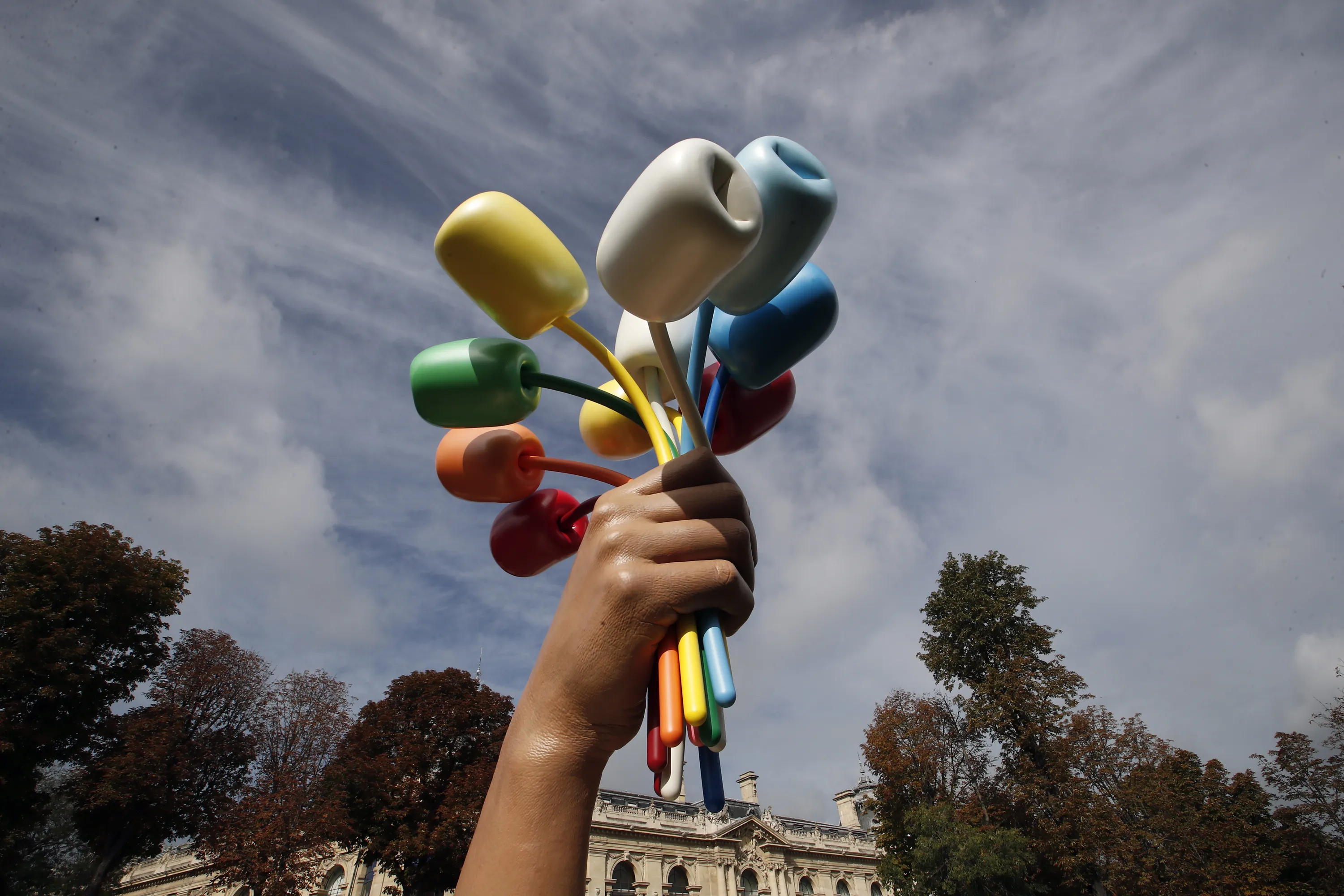 New York-based artist Jeff Koons poses as he unveiled his much-awaited and controversial sculpture “Bouquet of Tulips” dedicated to the victims of the terrorists attacks, in a garden next to the Champs-Elysee near the Petit Palais museum in Paris, Friday, October 4, 2019. (Photo by Francois Mori/AP Photo)