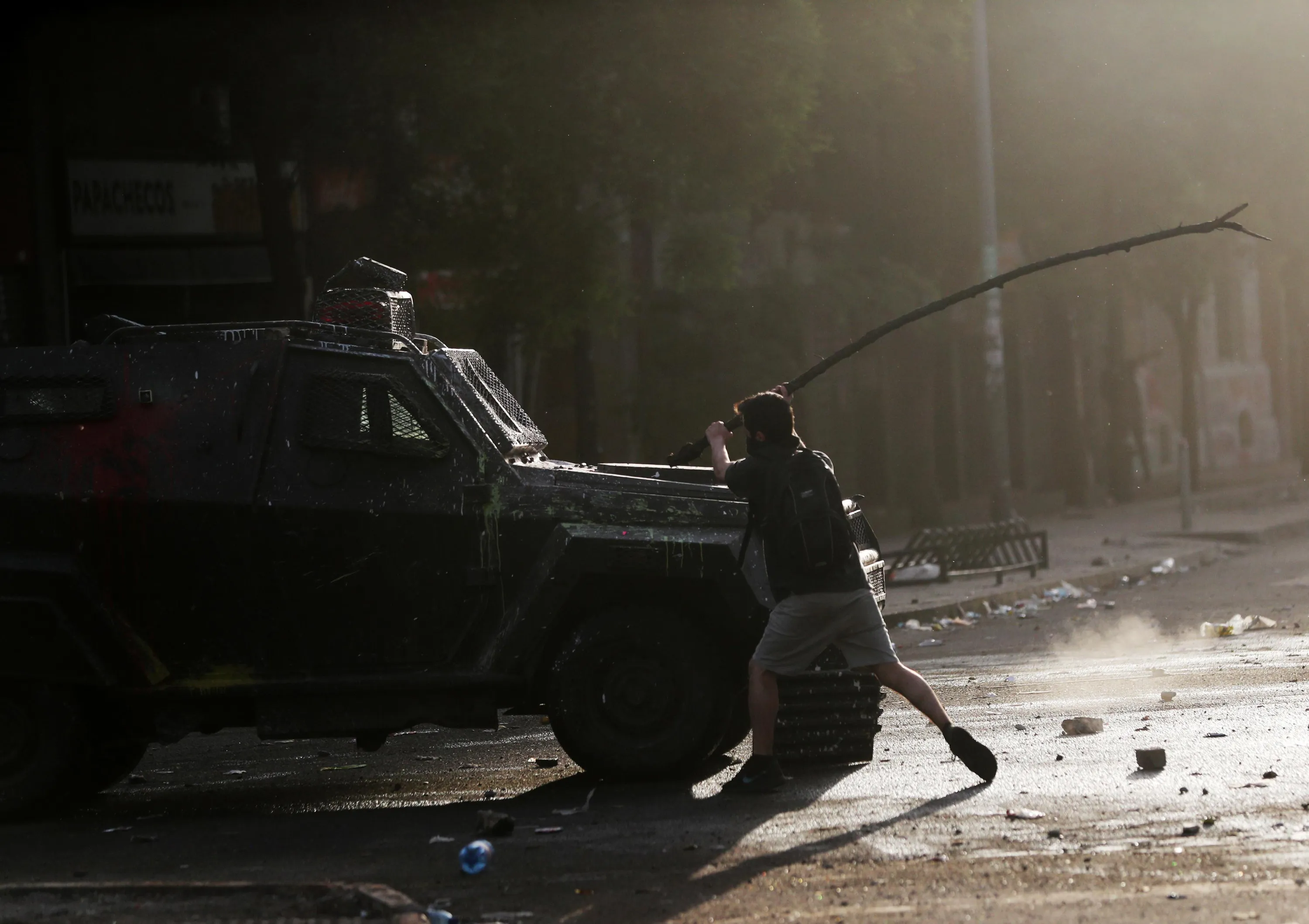 A demonstrator attacks a vehicle belonging to the security forces during a protest against Chile's state economic model in Santiago, Chile October 22, 2019. (Photo by Ivan Alvarado/Reuters)