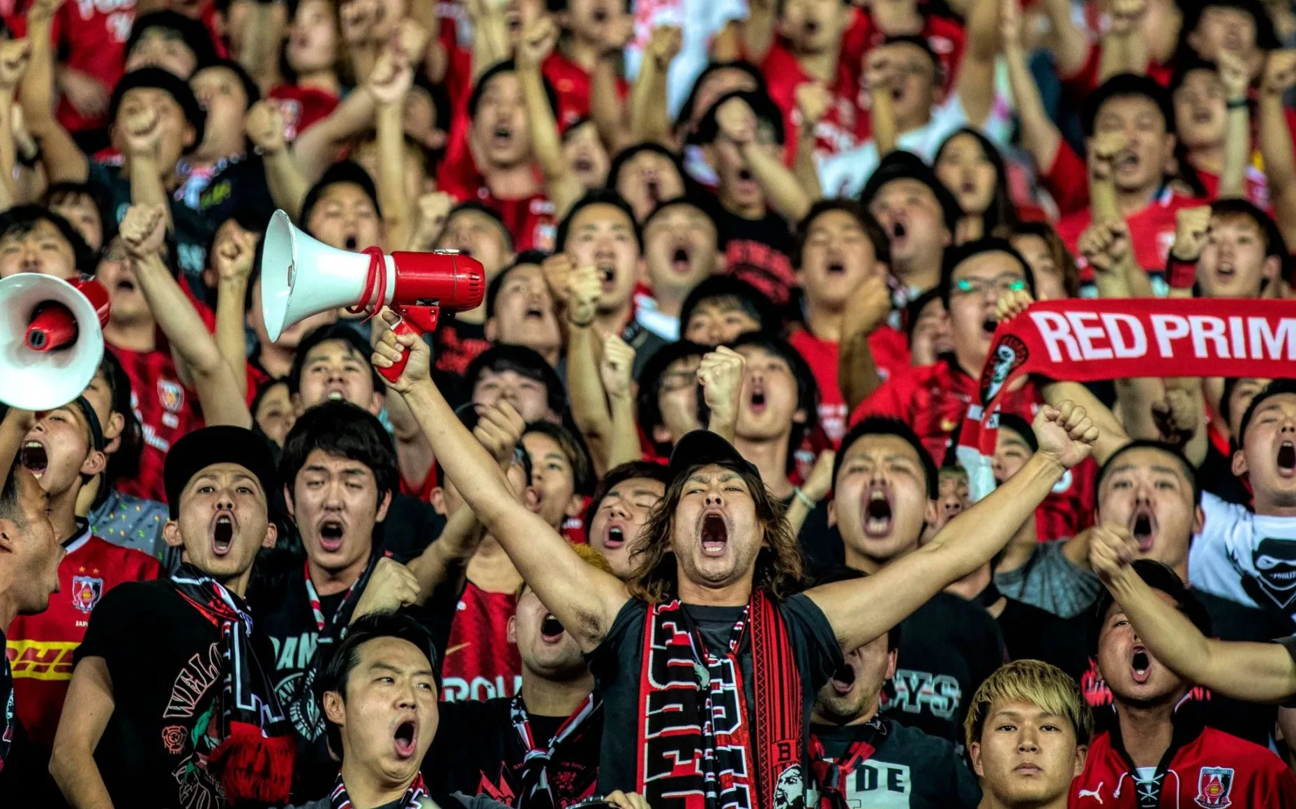 Supporters of Urawa Red Diamonds cheer before the AFC Champions League semi final second leg match between Guangzhou Evergrande and Urawa Red Diamonds in Guangzhou, China, 23 October 2019. (Photo by Alex Plavevski/EPA/EFE)