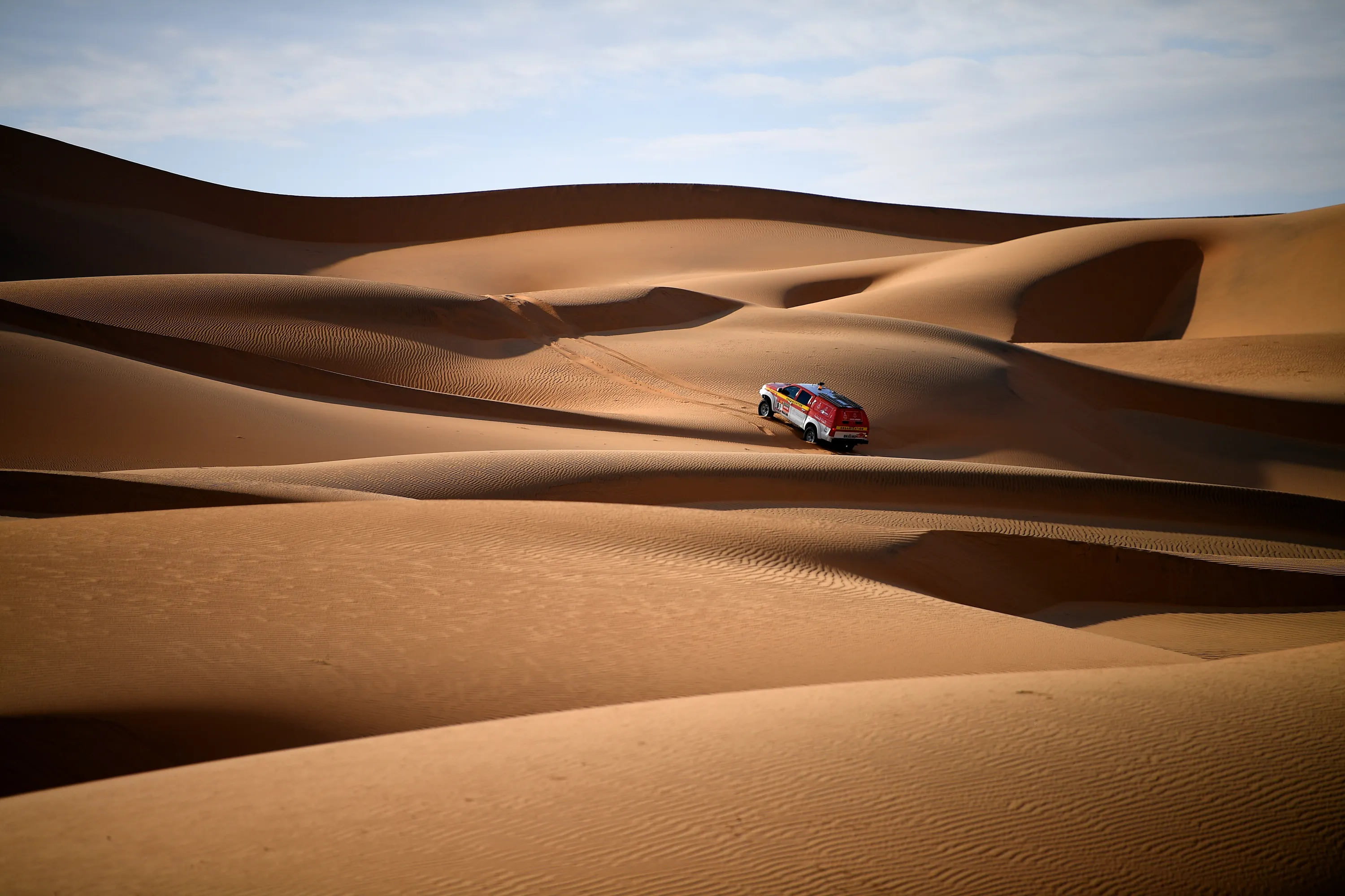 Dakar rally manager of the road book Pablo Eli and sports coordinator Edo Mossi drive on October 18, 2019 in Saudi Arabia during the recce for the next Dakar 2020 that will kick off on January 5 in Jeddah and will run untill January 17. (Photo by Franck Fife/AFP Photo)