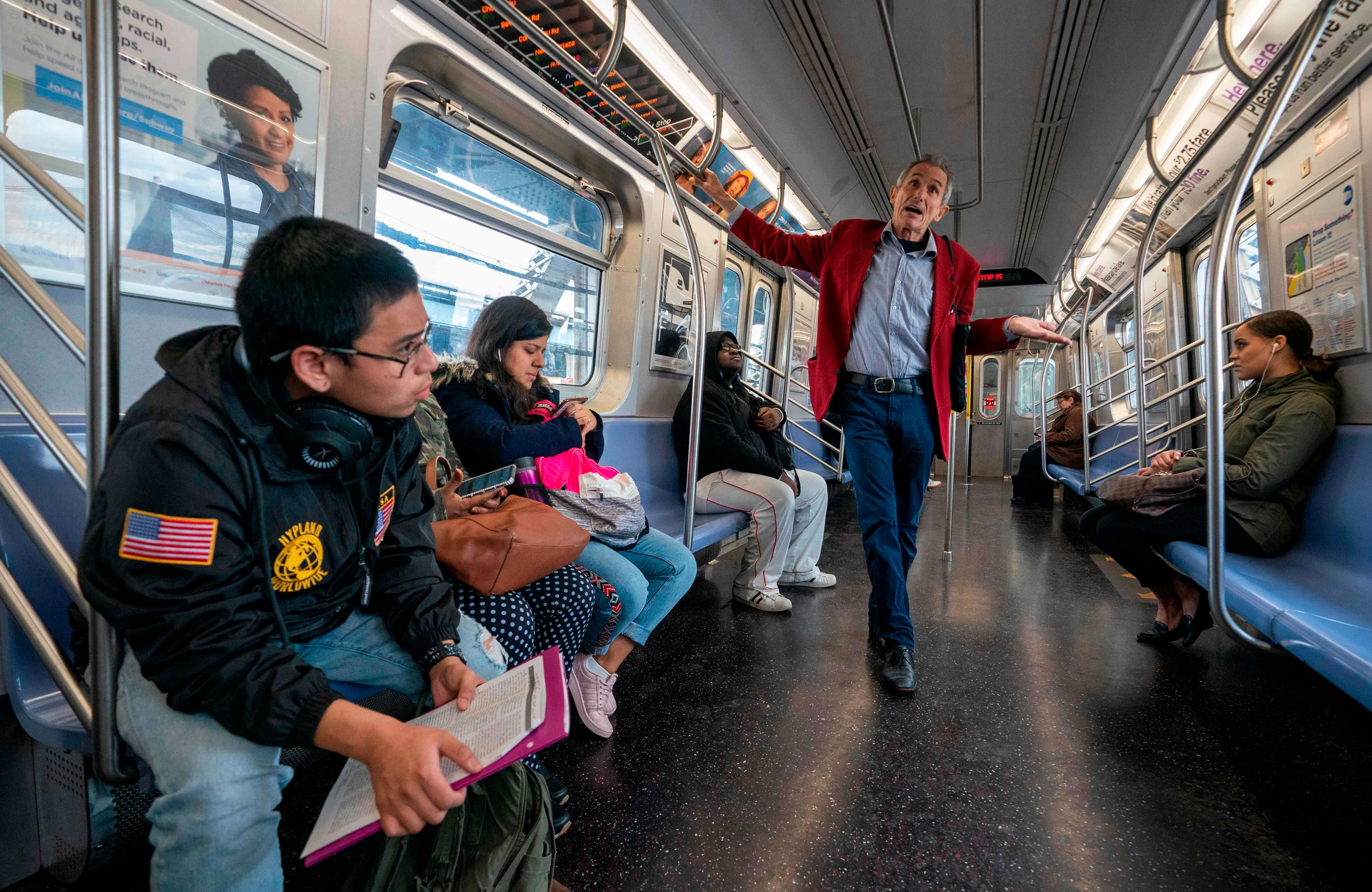 Richard McLachlan, a member of Extinction Rebellion, the environmental action pressure group founded in Britain, delivers his message about climate change to commuters in the subway October 17, 2019 in New York. “Good afternoon everyone. I don't want your money. But I would really like a few moments of your attention”, he bellows. Some riders continue to look down, others stare nervously in the opposite direction, but at least one removes their headphones and listens. (Photo by Don Emmert/AFP Photo)