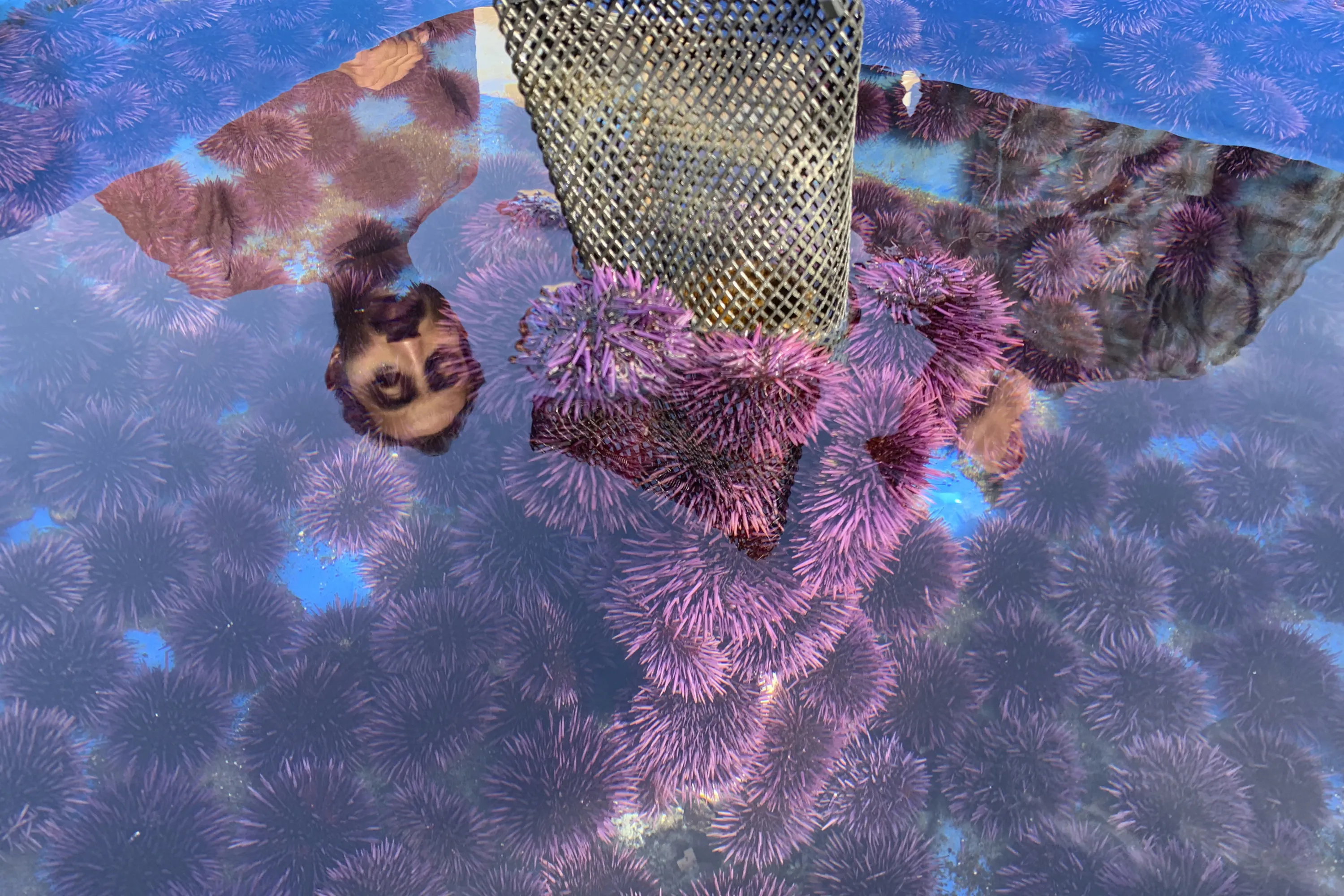 In this May 20, 2019 photo, a container at the Bodega Marine Lab in Bodega Bay, Calif. holds hundreds of live purple urchins harvested from the Mendocino County coast where they have been decimating kelp forests. Tens of millions of voracious purple sea urchins that have already chomped their way through towering underwater kelp forests in California are now spreading north to Oregon, sending the delicate marine ecosystem off the shore into such disarray that other critical species are starving to death. (Photo by Terry Chea/AP Photo)