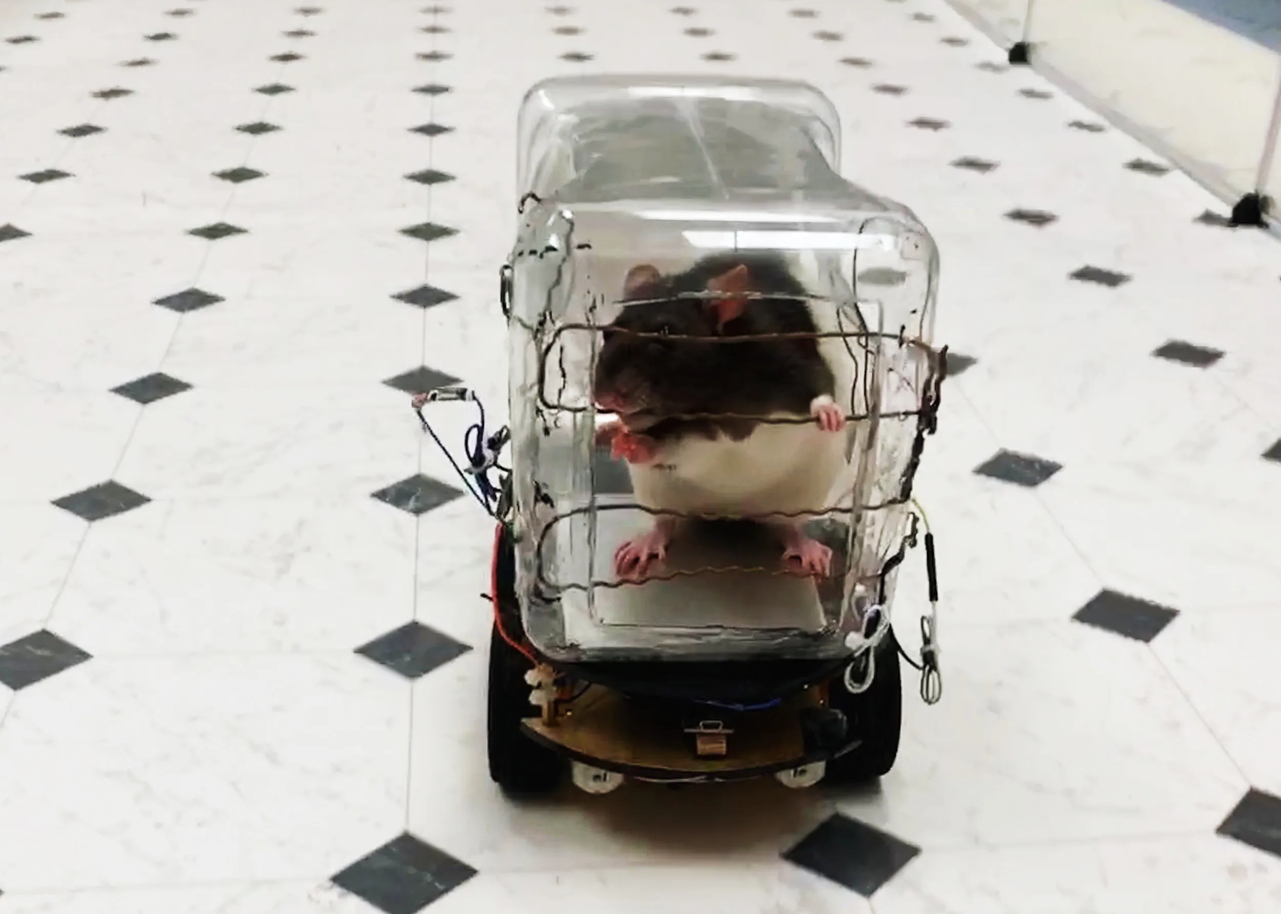This image courtesy of the University of Richmond shows a lab rat driving the “RatCar” on October 1, 2019, in Richmond, Virginia. Scientists have reported successfuly training the rodents to drive tiny cars in exchange for tasty bits of Froot Loops cereal, and found that learning the task lowered their stress levels. The study not only advances our understanding of how sophisticated rat brains are, but could one day help in developing new non-pharmaceutical forms of treatment for mental illness, senior author Kelly Lambert of the University of Richmond told AFP on October 23, 2019. (Photo by HO/University of Richmond/AFP Photo)