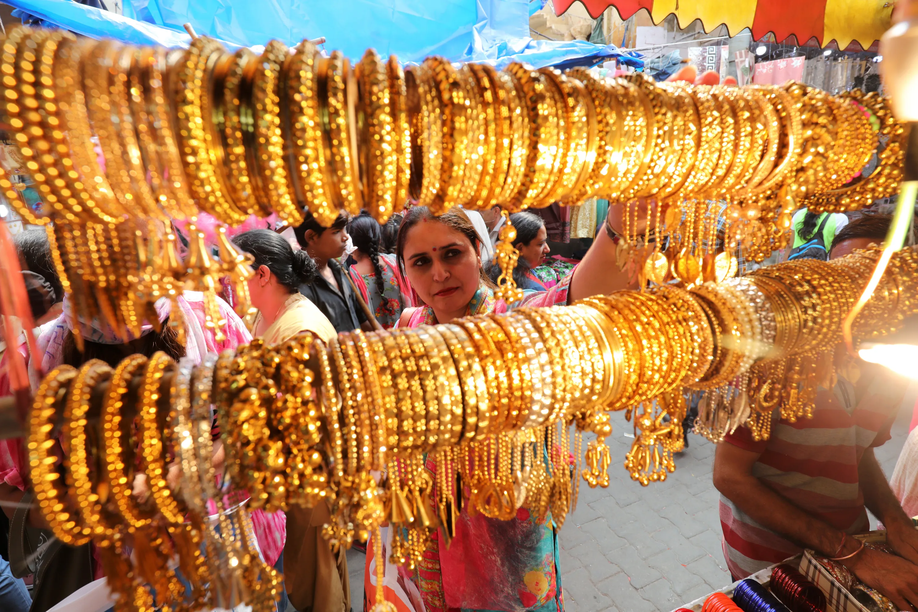 Indian women buy bangles on the eve of the Karva Chauth festival in Jammu, the winter capital of Kashmir, India, 16 October 2019. On Karva Chauth day Hindu married women observe fast and pray for the longevity and well being of their husbands. Karva Chauth festival will be observed on 17 October this year. (Photo by Jaipal Singh/EPA/EFE)