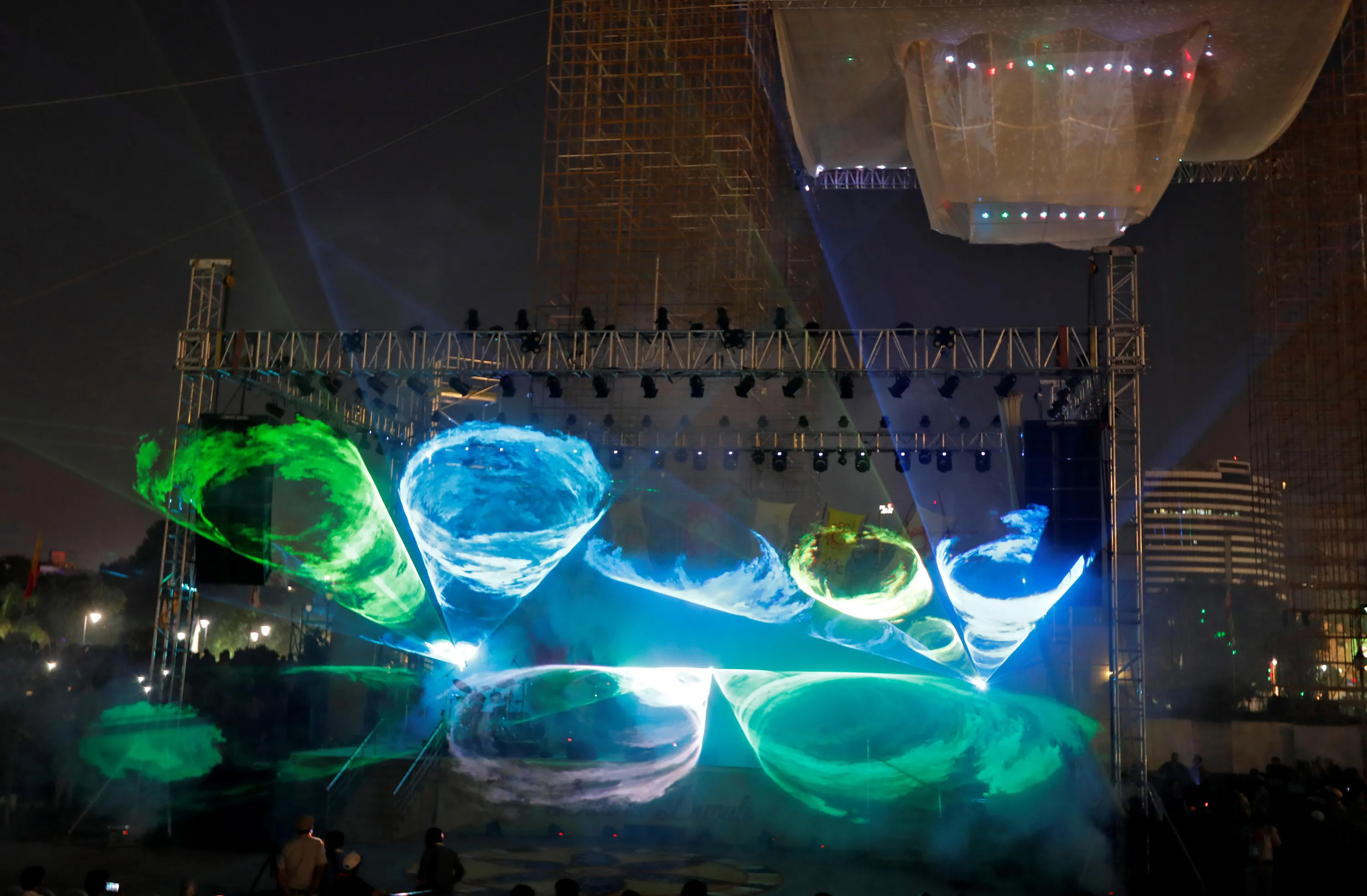 A laser light show, organized by Delhi authorities to stop people from burning crackers, plays during Diwali, the Hindu festival of lights, celebrations at the Connaught Place in New Delhi, India, October 27, 2019. (Photo by Altaf Hussain/Reuters)