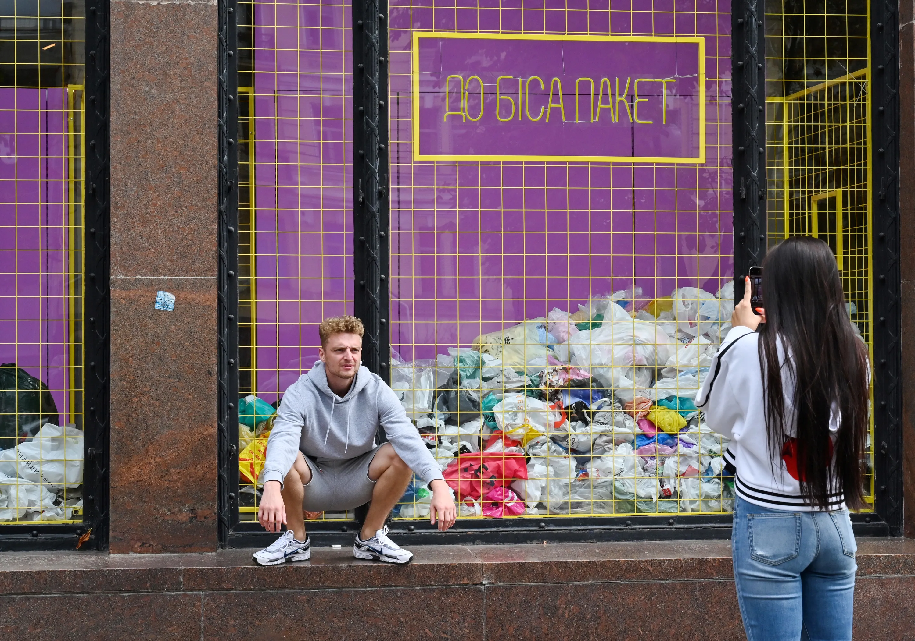 A man poses as a woman takes a smartphone picture in front of a shop window displaying a load of used plastic bags under an inscription reading “Go to hell with the package” in Kiev on September 4, 2019. The “All locals” store for the first time in Ukraine refuses to use plastic bags in an effort to change the consumption behavior of the Ukrainians. The average Ukrainian uses 500 plastic bags a year on average. (Photo by Sergei Supinsky/AFP Photo)