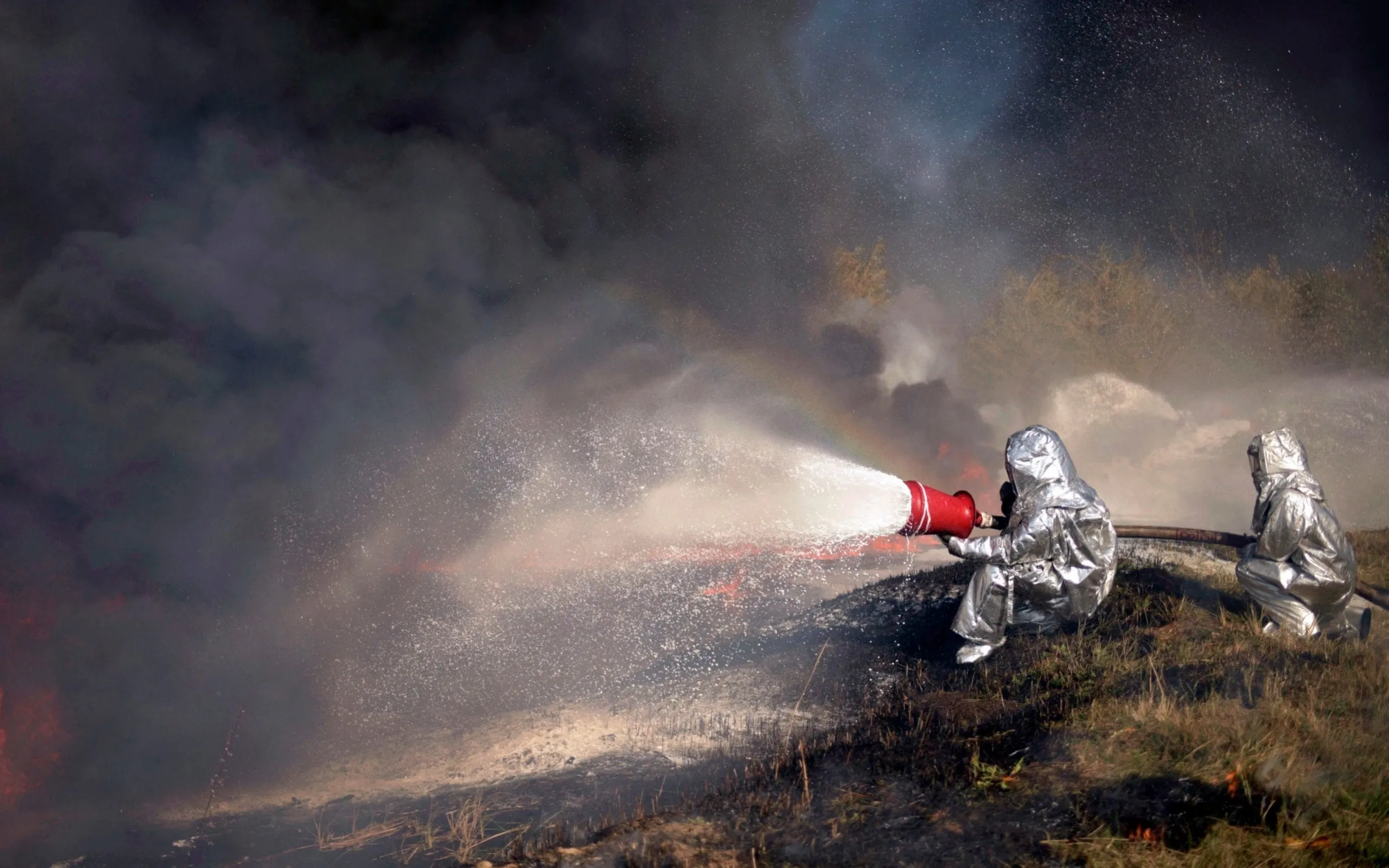 Ukrainian rescuers extinguish a fire on a lake as part of their psychological training during a drills near the Boryslav city, some 70 km from Western-Ukrainian city of Lviv, 16 October 2019. (Photo by Ukrinform/Barcroft Media)