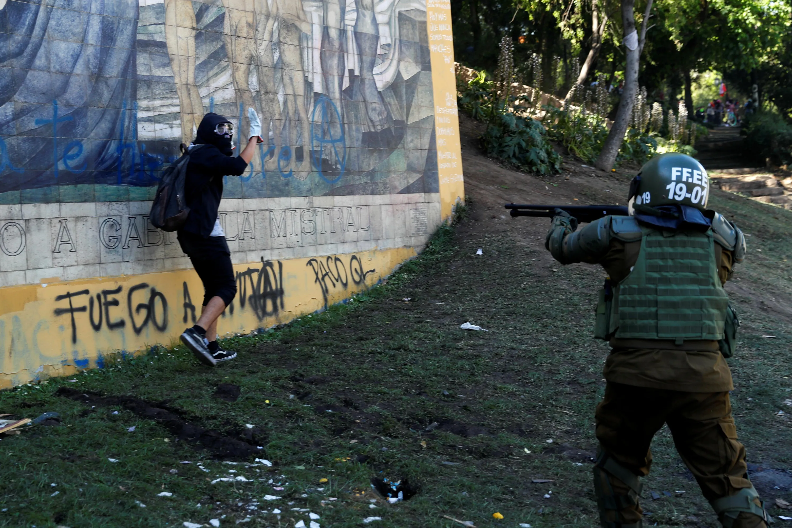 A police officer aims his weapon at a demonstrator during a protest against Chile's government in Santiago, Chile October 30, 2019. (Photo by Jorge Silva/Reuters)