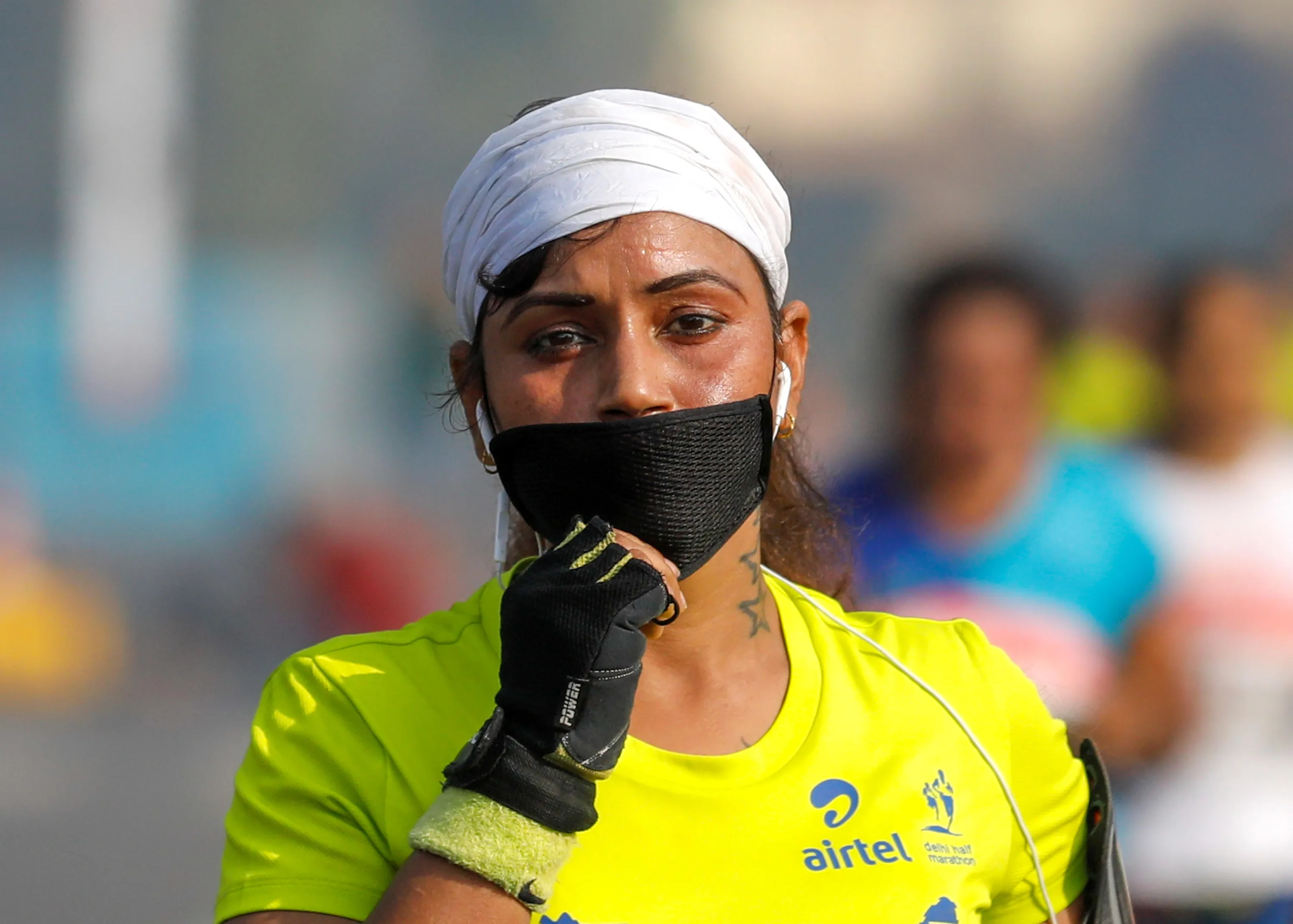 A runner wearing a face mask for protection from air pollution takes part in the Airtel Delhi Half Marathon in New Delhi, India, October 20, 2019. (Photo by Anushree Fadnavis/Reuters)