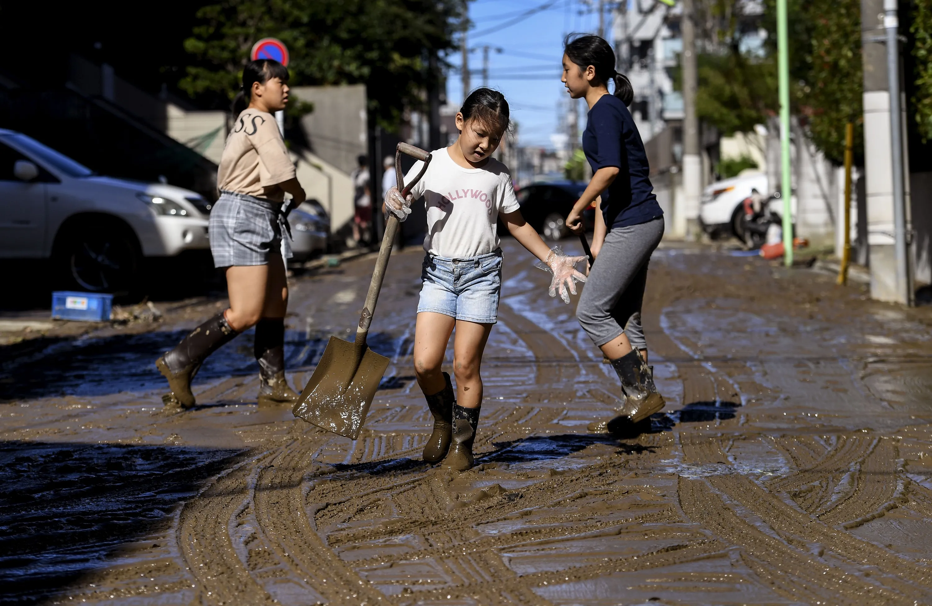 Children clear mud from a street after floodwaters receded in the aftermath of Typhoon Hagibis, in Kawasaki on October 13, 2019. Japan's military scrambled October 13 to rescue people trapped by flooding after powerful Typhoon Hagibis ripped across the country, killing at least 11 people and leaving more than a dozen missing. (Photo by William West/AFP Photo)