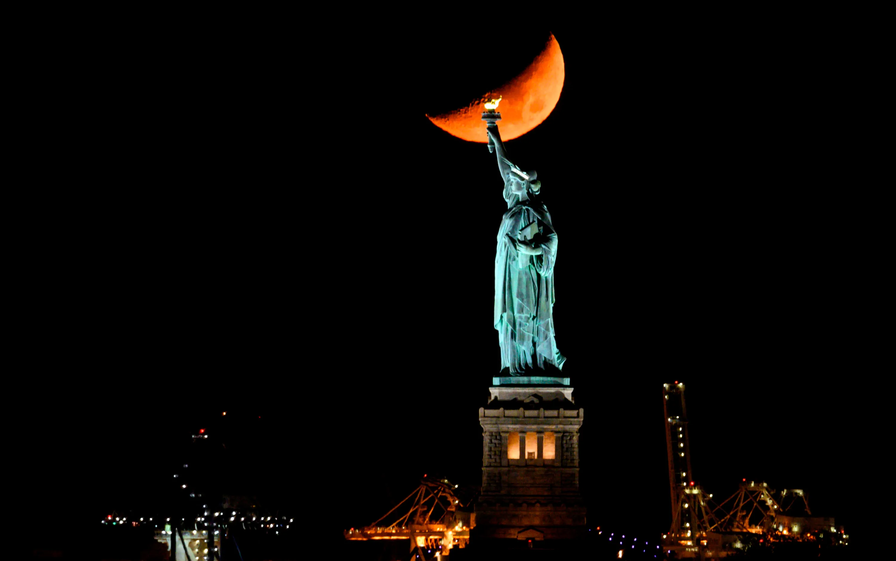 The moon sets behind the Statue of Liberty on November 2, 2019 in New York City. (Photo by Johannes Eisele/AFP Photo)