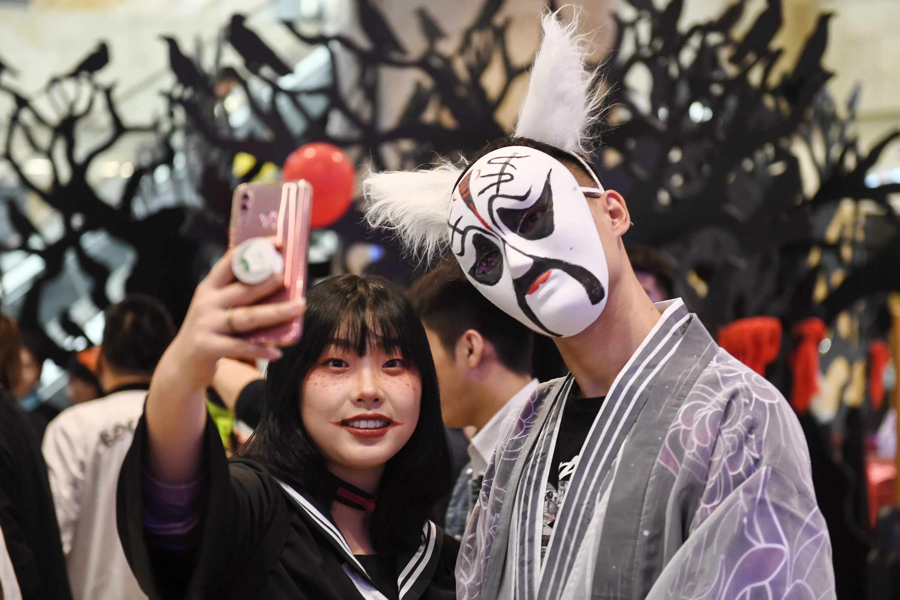 This photo taken on October 31, 2019 shows people in costumes taking a selfie during a Halloween event in Nanjing in China's eastern Jiangsu province. (Photo by AFP Photo/China Stringer Network)