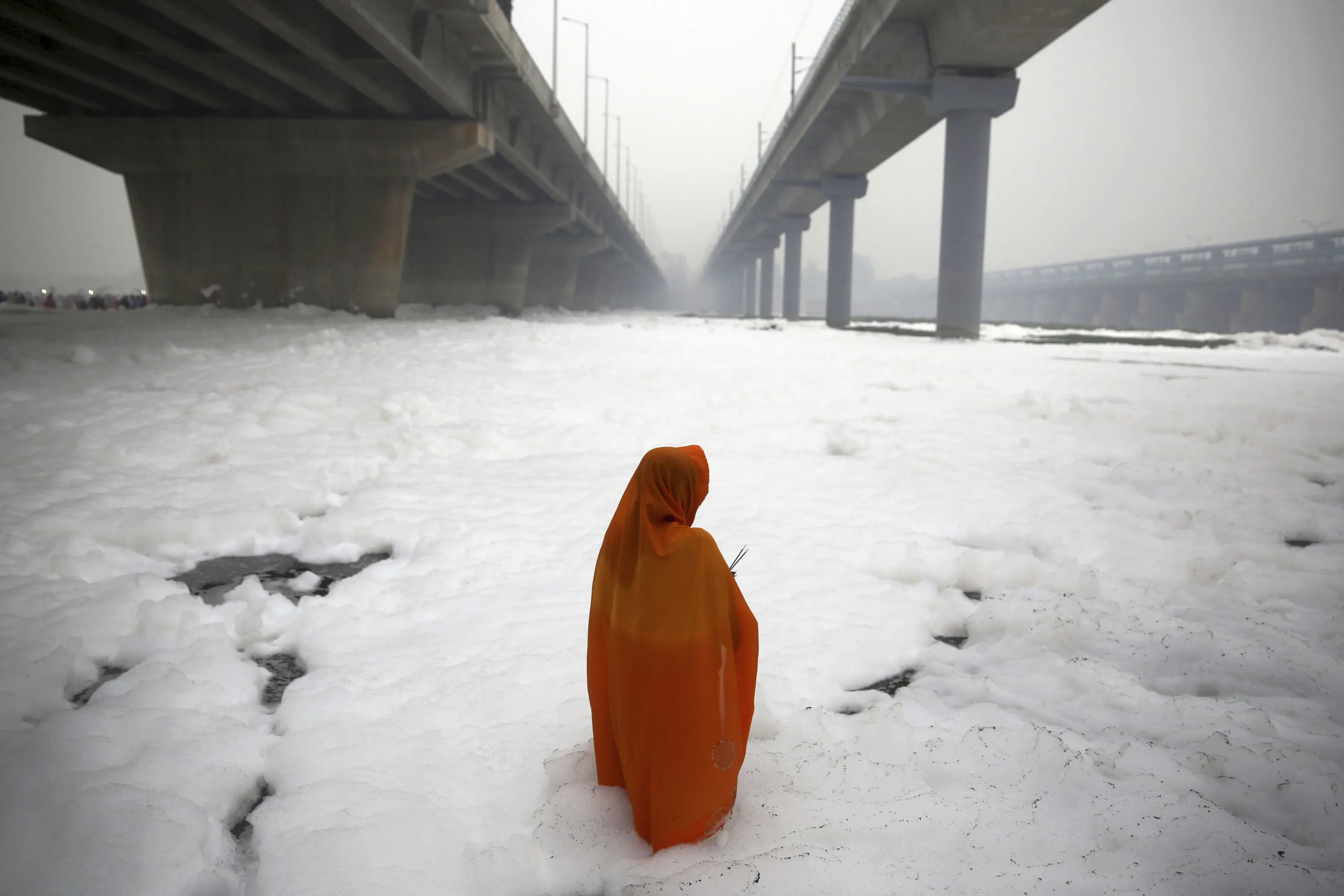 In this Saturday, November 2, 2019, file photo, an Indian Hindu devotee performs rituals in the Yamuna river, covered with chemical foam caused by industrial and domestic pollution, during Chhath Puja festival in New Delhi, India. Schools have reopened in the Indian capital with toxic air level coming down by more than half since authorities declared a health emergency last Friday. Authorities are tackling a large amount of toxic foam floating in the Yamuna River, caused partly by high ammonia levels emanating from industrial pollutants. (Photo by Altaf Qadri/AP Photo/File)