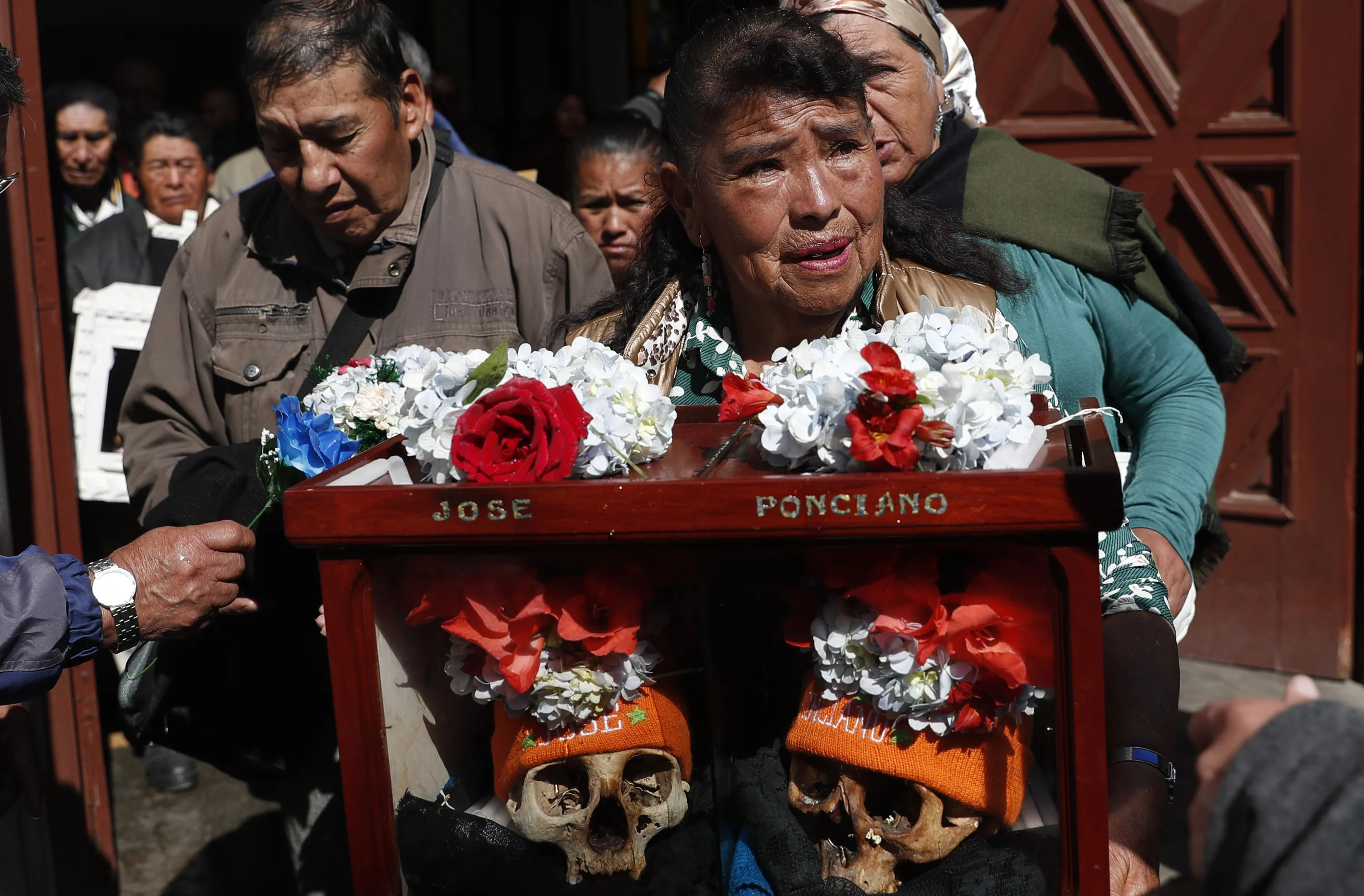 A woman carries decorated human skulls after praying in the chapel at the General Cemetery during the “Natitas” festival in La Paz, Bolivia, Friday, November 8, 2019. The skulls, called “natitas”, which means “without a nose” in the indigenous Aymara language, are cared for and decorated by faithful who use them as amulets, believing they serve as protection. The tradition marks the end of the Catholic All Saints holiday, but is not recognized by the Catholic church. (Photo by Juan Karita/AP Photo)