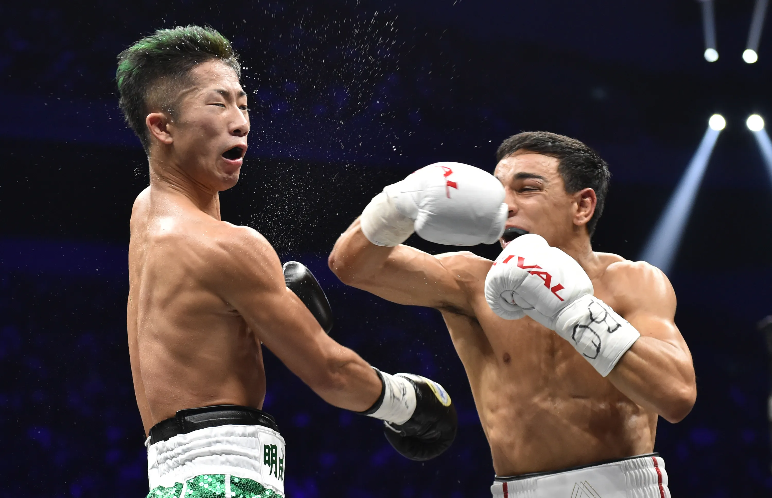 France's Nordine Oubaali (R) fights with of Japan's Takuma Inoue during their WBC bantamweight title boxing match at Saitama Super Arena in Saitama on November 7, 2019. (Photo by Kazuhiro Nogi/AFP Photo)