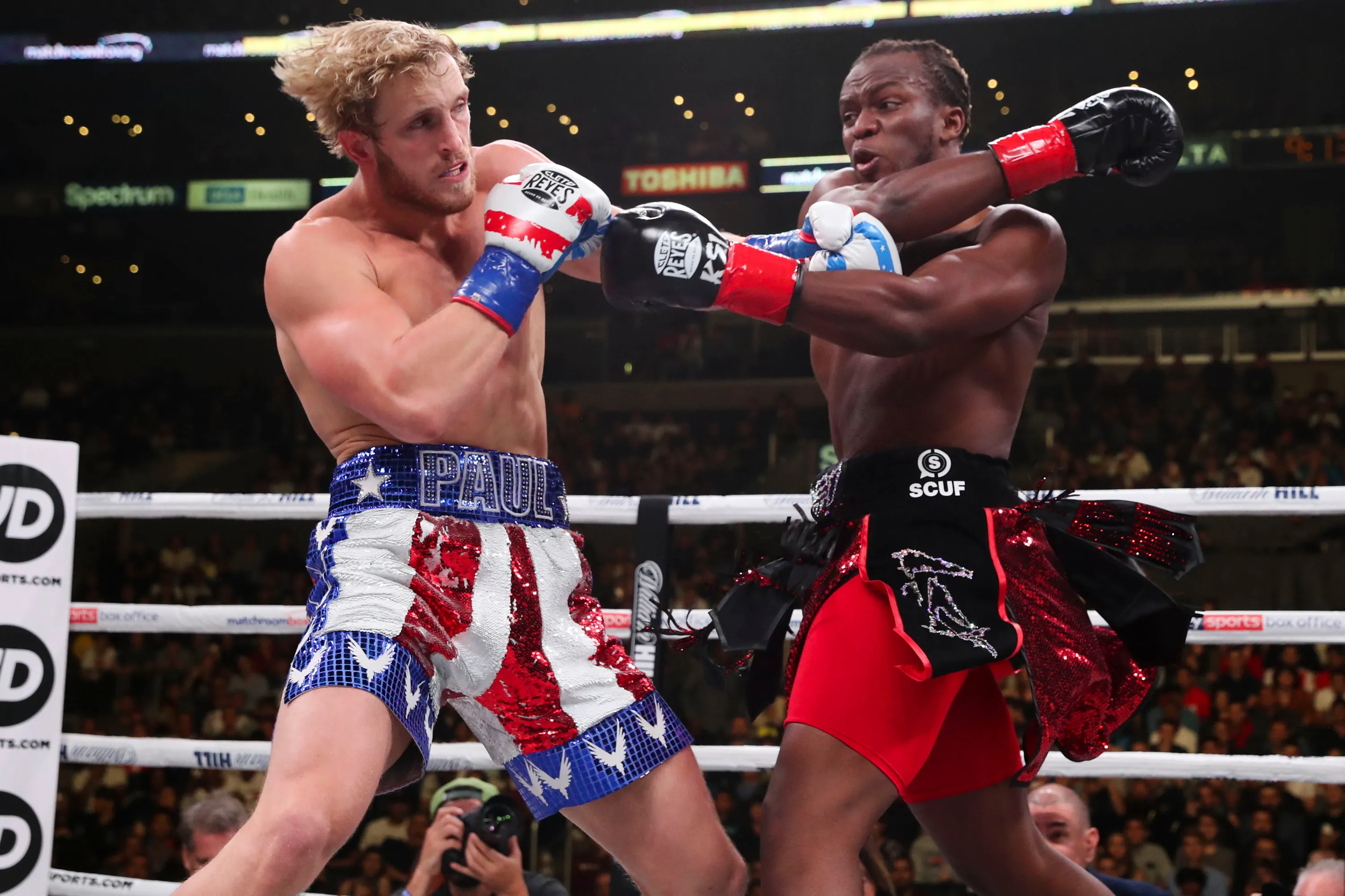 Logan Paul (red/white/blue shorts) and KSI (black/red shorts) exchange punches during their pro debut fight at Staples Center on November 9, 2019 in Los Angeles, California. KSI won by decision. (Photo by Ed Mulholland/Matchroom Boxing USA)