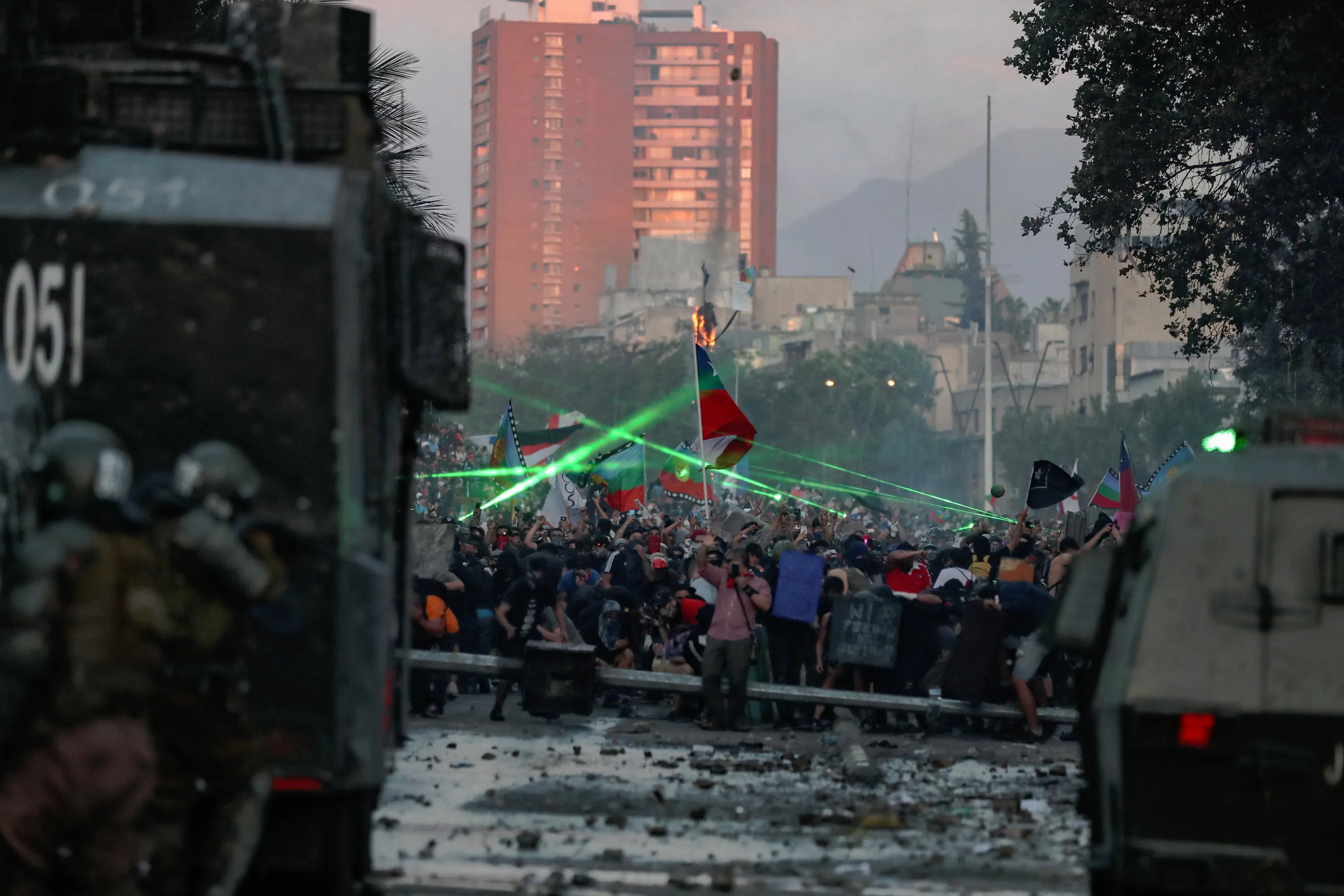 Riot police and demonstrators are seen amid laser beams during a protest against Chile's government in Santiago, Chile on November 12, 2019. (Photo by Ivan Alvarado/Reuters)
