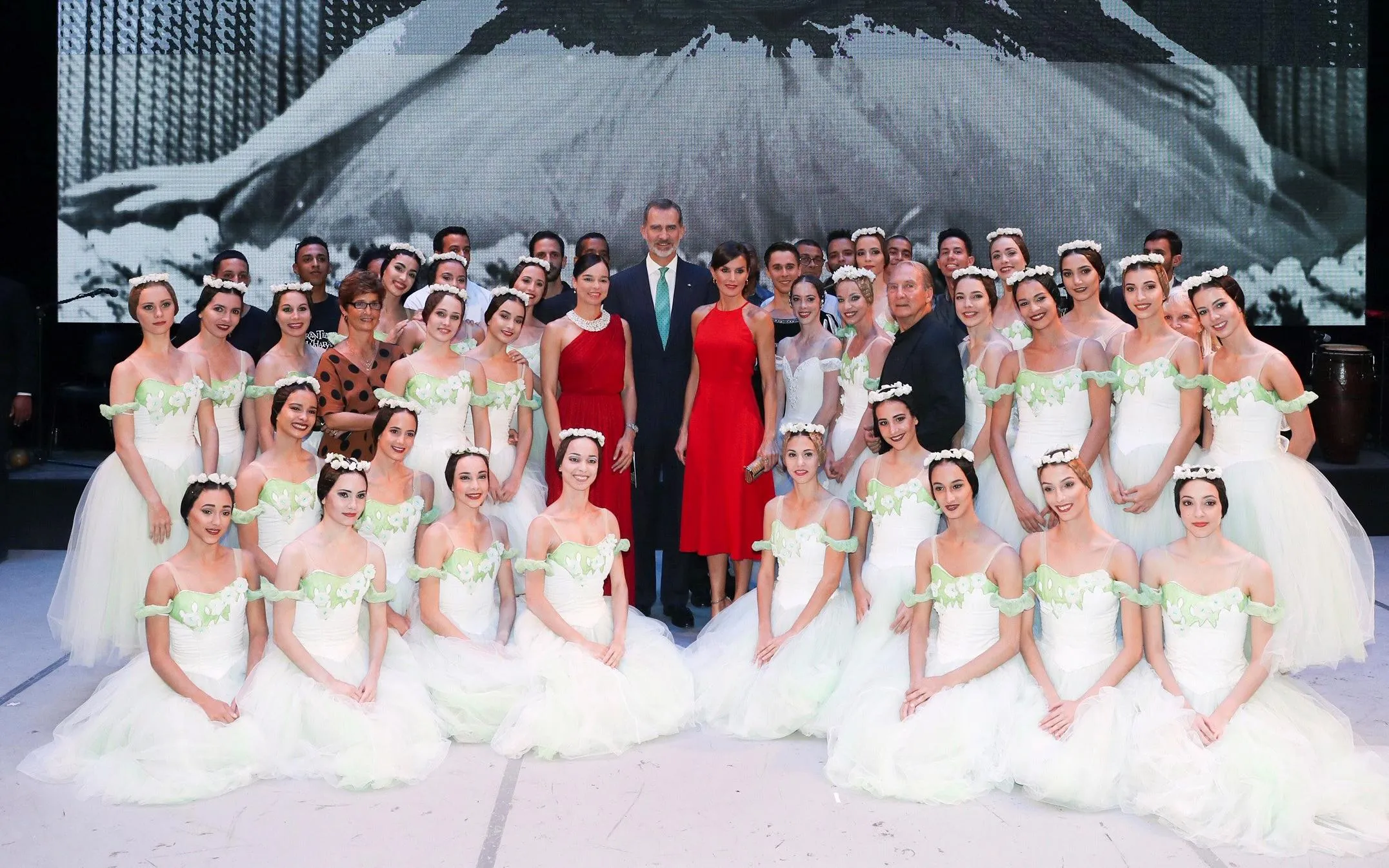 A handout photo made available by Spanish Royal Household shows Spain's King Felipe VI (C-L) and Queen Letizia (C-R) posing for a group photo with some dancers at Gran Teatro theater in Havana, Cuba, 12 November 2019 (issued 13 November 2019). Cuba's National Ballet company performed a passage of Giselle ballet as part of a gala in Spanish royal couple's honor. Spanish monarch and his wife are on a state visit in Cuba. (Photo by Jose A. Jimenez/EPA/EFE)