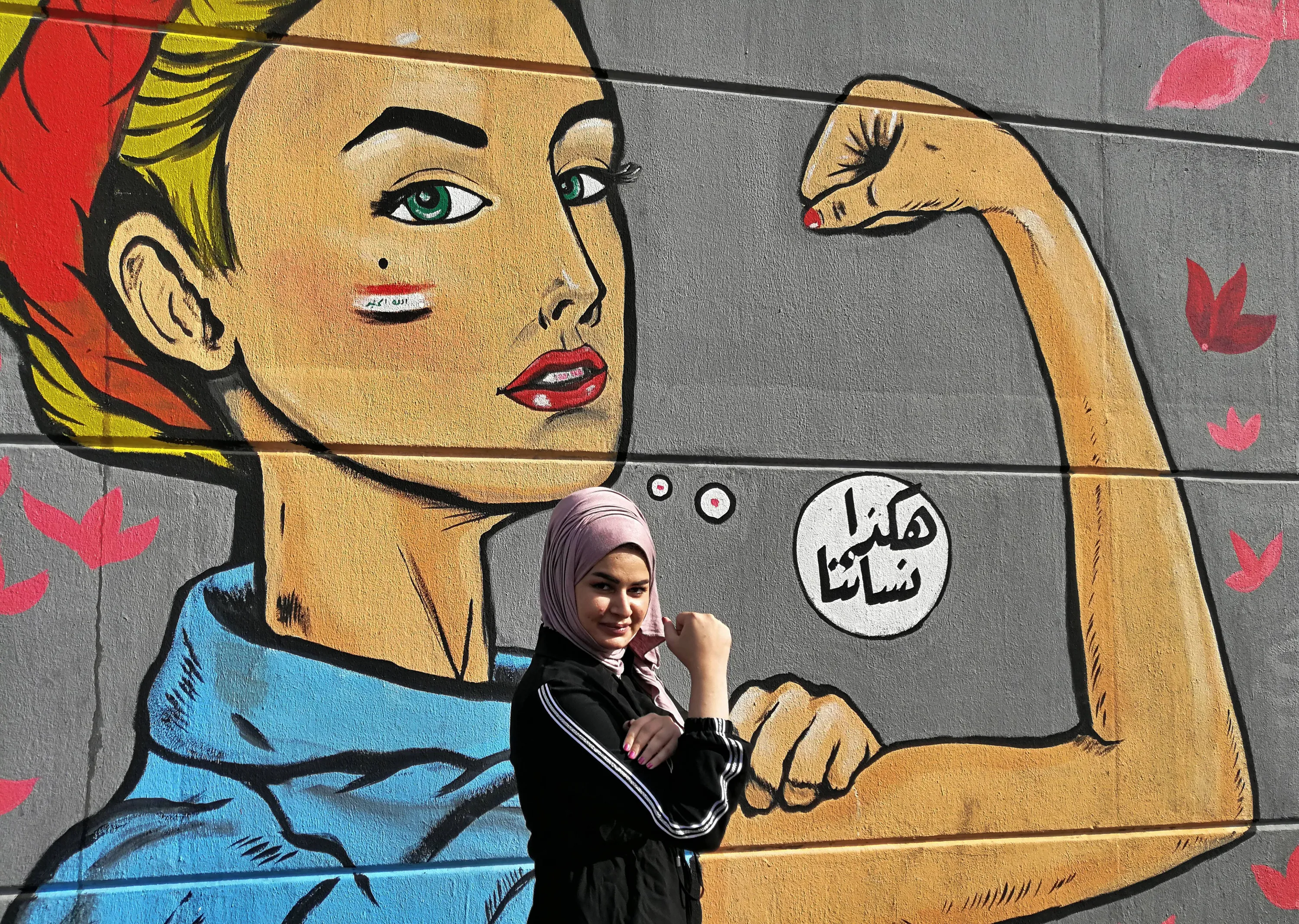 A woman poses for a picture near a graffiti with Arabic reading “those are our women” during ongoing protests near Tahrir Square in Baghdad, Iraq, Thursday, November 7, 2019. (Photo by Khalid Mohammed/AP Photo)