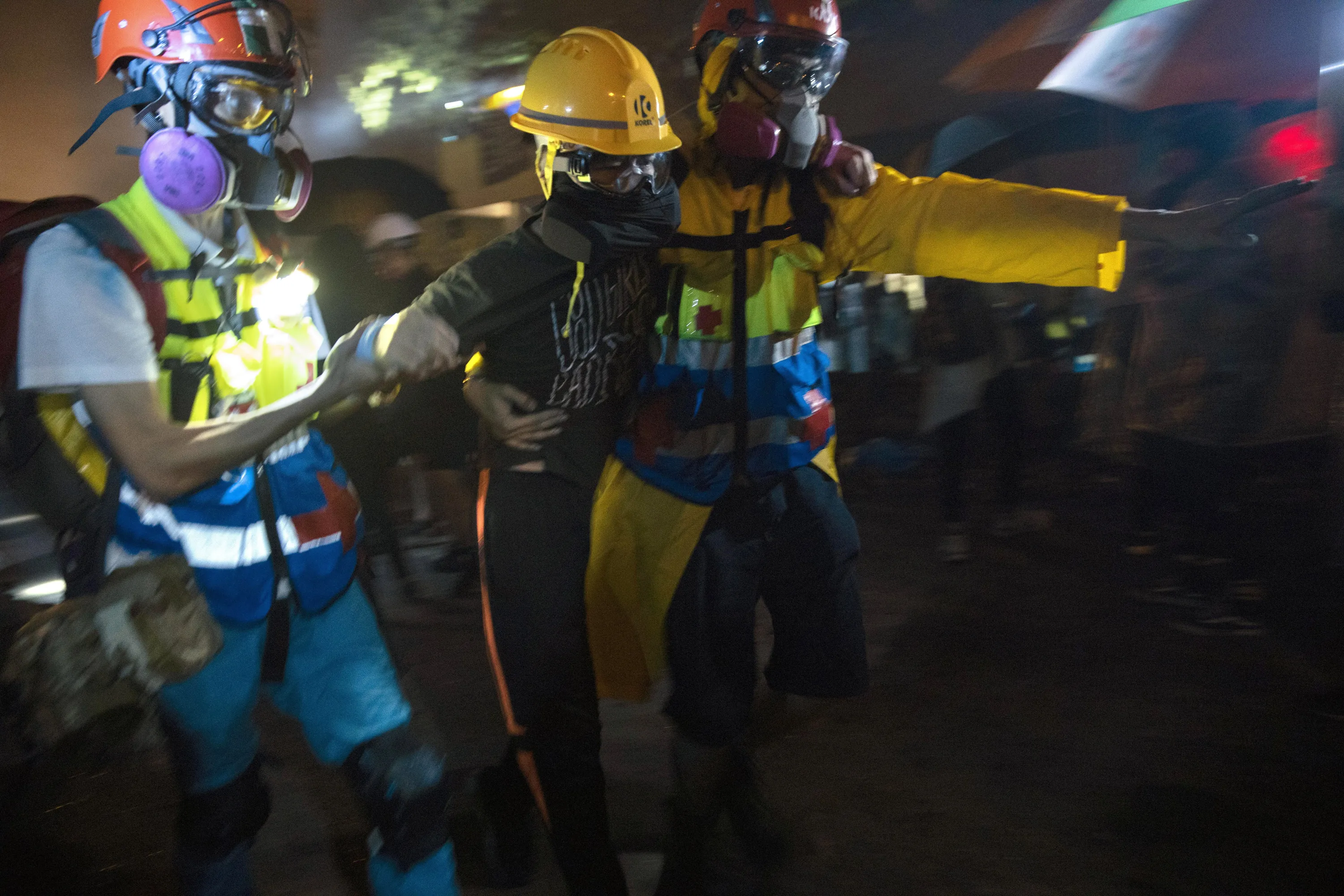 In this Sunday, November 17, 2019, photo, medical volunteers help a protester retreat from the front lines of a barricade outside the Hong Kong Polytechnic University in Hong Kong. Fiery explosions were seen early Monday as Hong Kong police stormed into the university held by protesters after an all-night standoff. (Photo by Ng Han Guan/AP Photo)