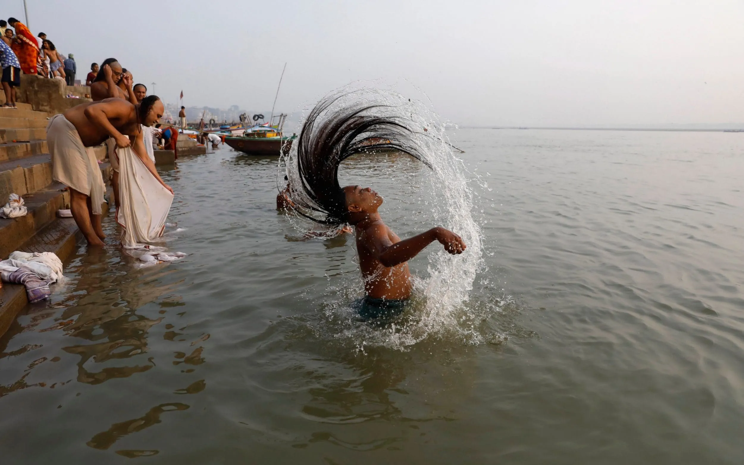 In this November 13, 2019, photo, a Hindu devotee takes a holy dip in the River Ganges in Varanasi, India. Varanasi is among the world's oldest cities, and millions of Hindu pilgrims gather annually here for ritual bathing and prayers in the Ganges River, considered holiest by Hindus. (Photo by Rajesh Kumar Singh/AP Photo/File)
