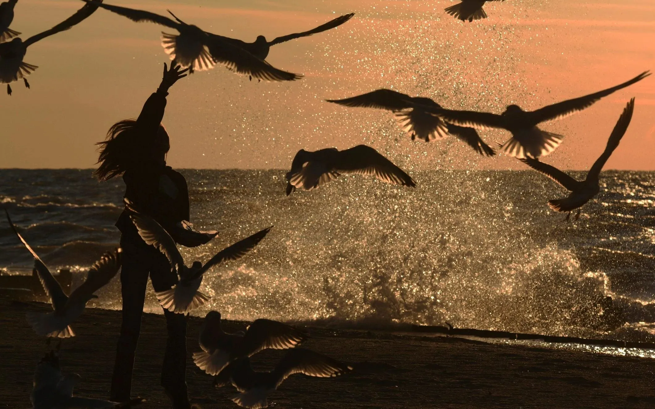 A girl feeds seagulls as the sun sets along Lions Park Beach in St. Joseph, Mich., Tuesday, November 5, 2019. (Photo by Don Campbell/The Herald-Palladium via AP Photo)