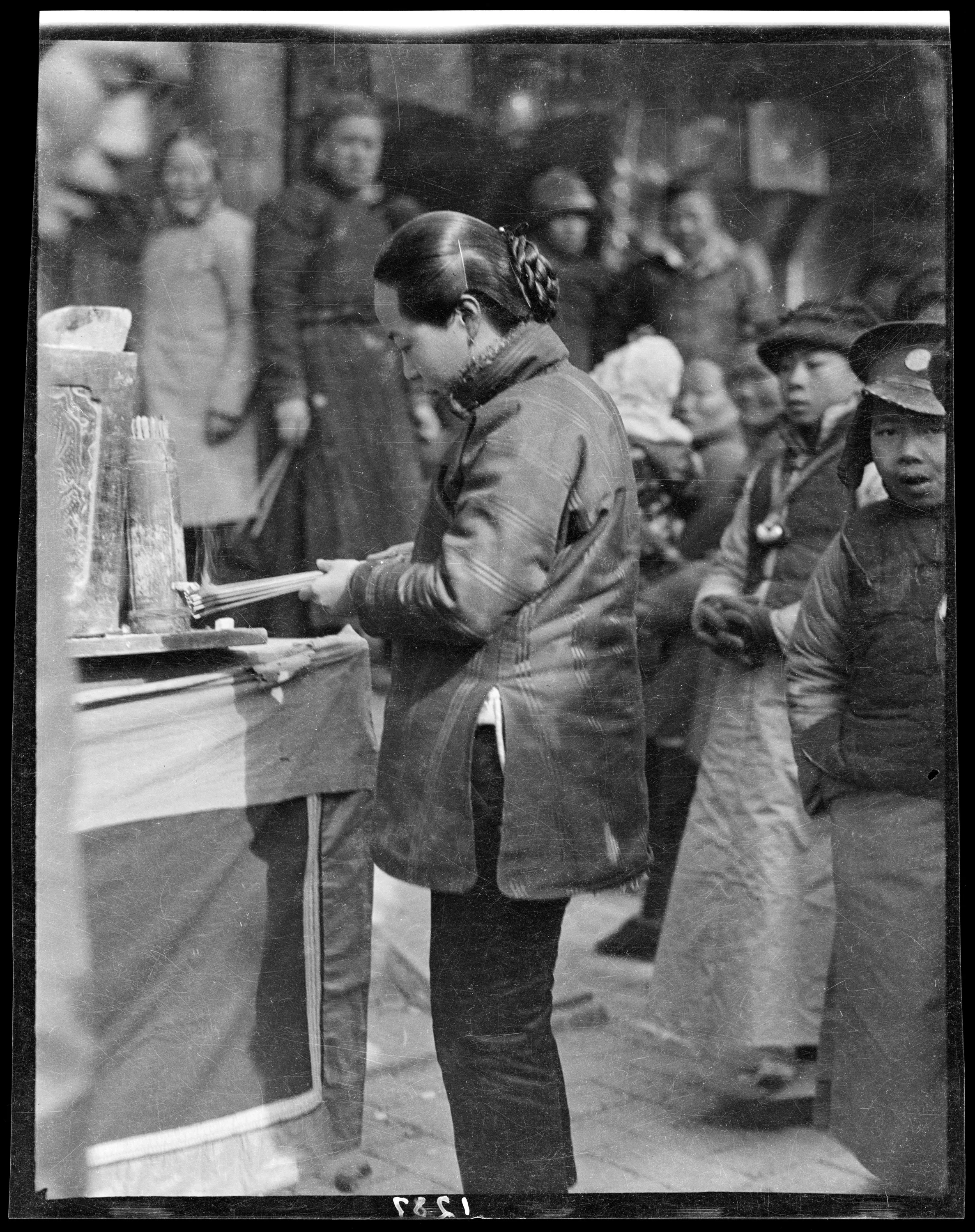 New Year's worship, Woman lighting Incense. China, Baoding Fu, February 1, 1919. (Photo by Sidney David Gamble)