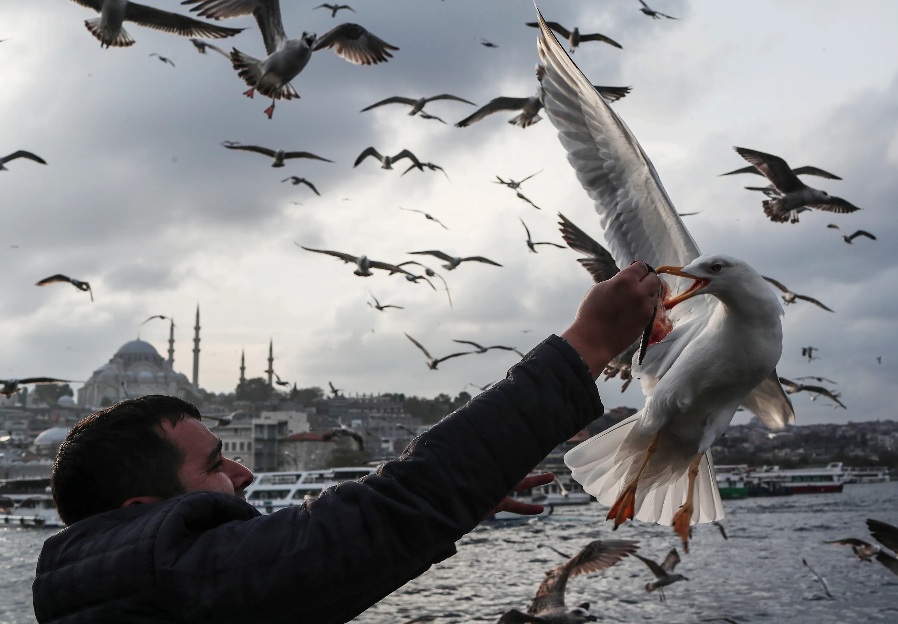 A man feeds seagulls with fish under the Galata Bridge in Istanbul, Turkey, 22 November 2019. (Photo by Sedat Suna/EPA/EFE)