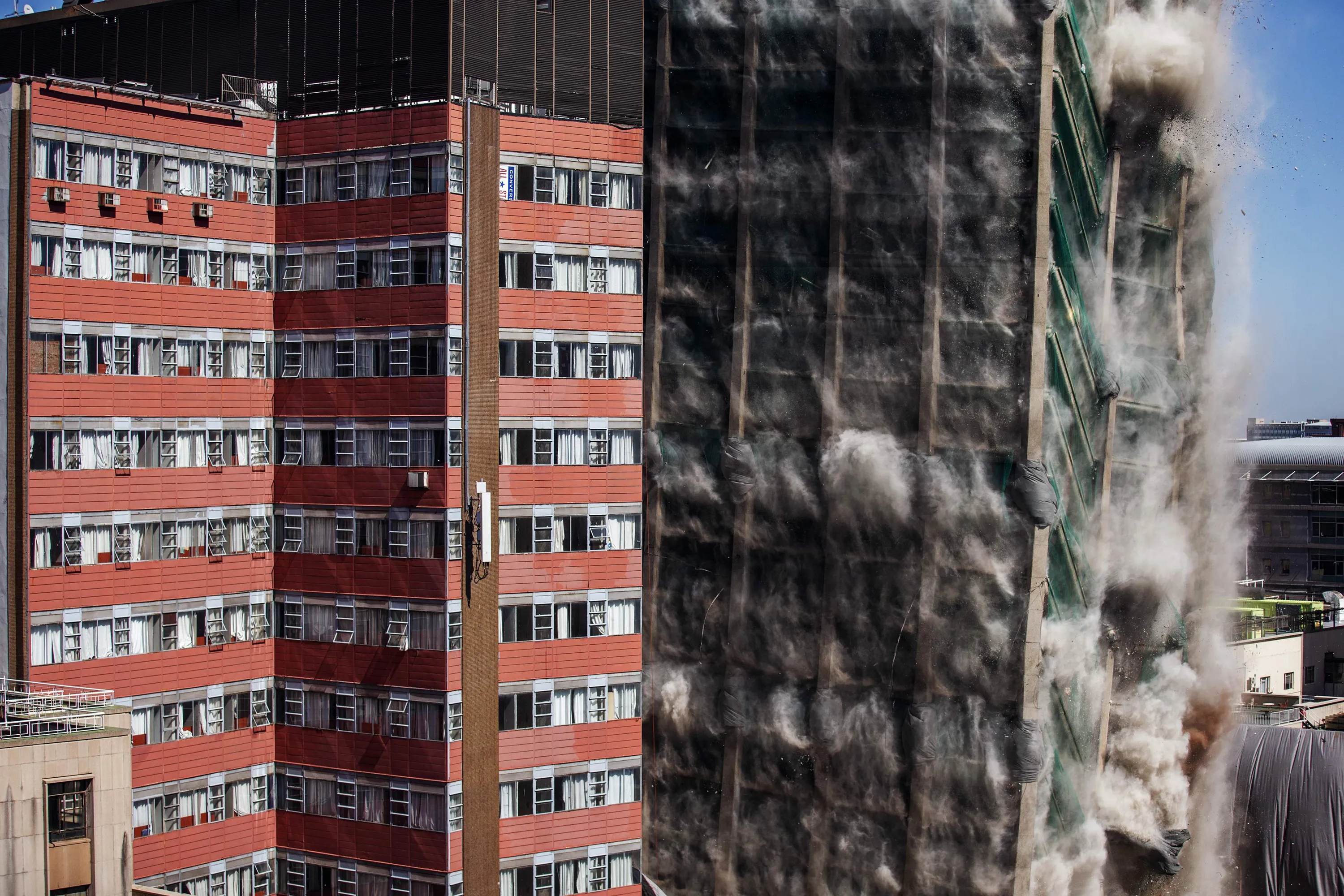 This picture taken on November 24, 2019 shows the Bank of Lisbon building imploding in Johannesburg, South Africa. Johannesburg CBD's iconic Bank of Lisbon building has been demolished after it was deemed structurally unfit following a 2018's fire which lasted three days and claimed the lives of three firefighters. (Photo by Michele Spatari/AFP Photo)