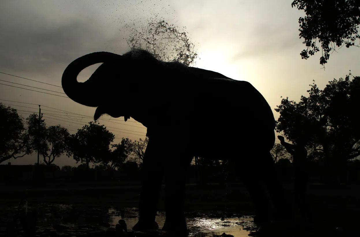 An Indian mahout bathes his elephant on a hot summer day in Allahabad, India, on June 18, 2012. Northern India has been sweltering under extreme heat as maximum temperatures hovered around 45 degrees Celsius (113F) in some areas. (Photo by Rajesh Kumar Singh/AP Photo)