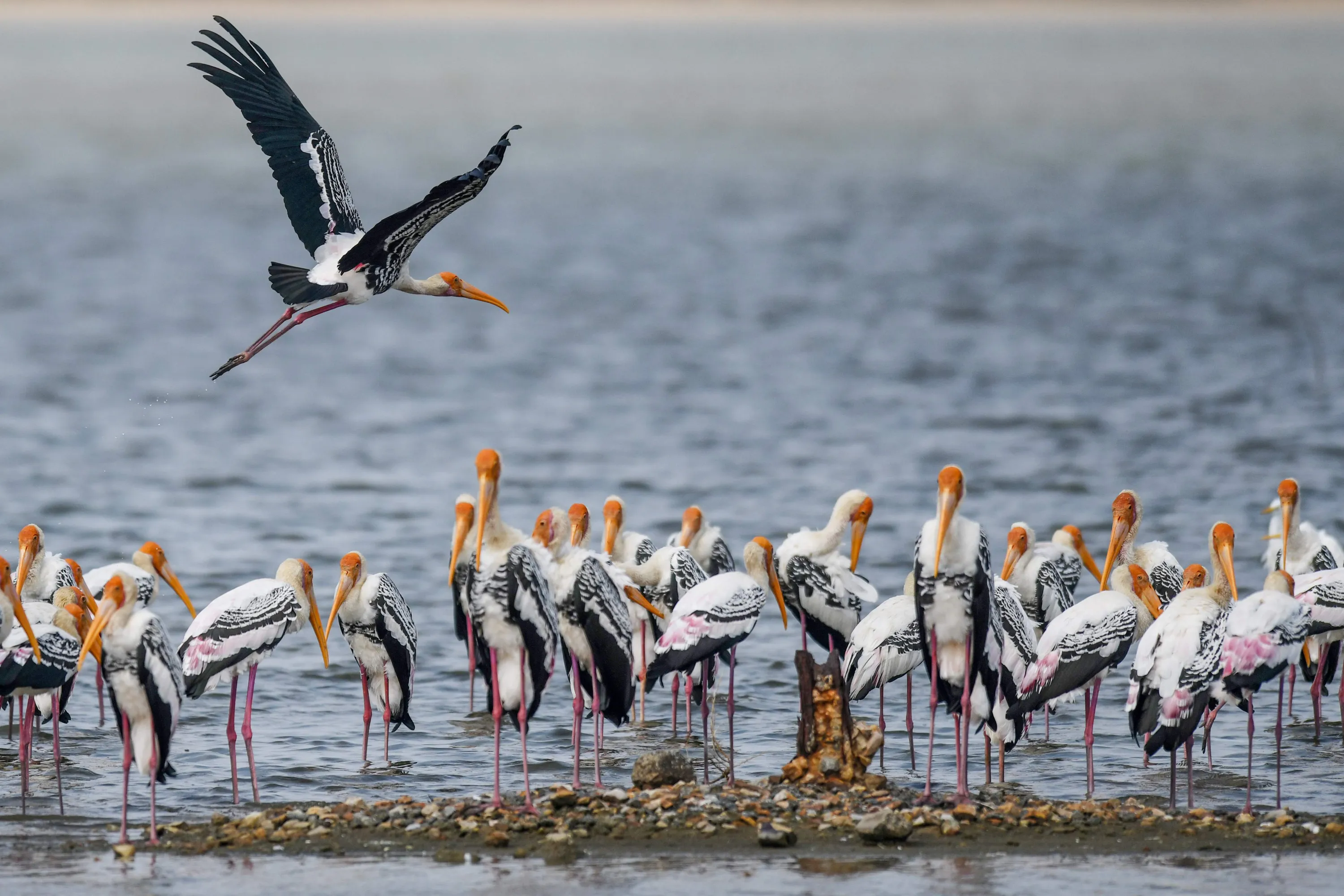 A painted stork flies past as others scout for fish at Pulicat Lake in Sriharikota in southeastern state of Andhra Pradesh on November 27, 2019. (Photo by Arun Sankar/AFP Photo)