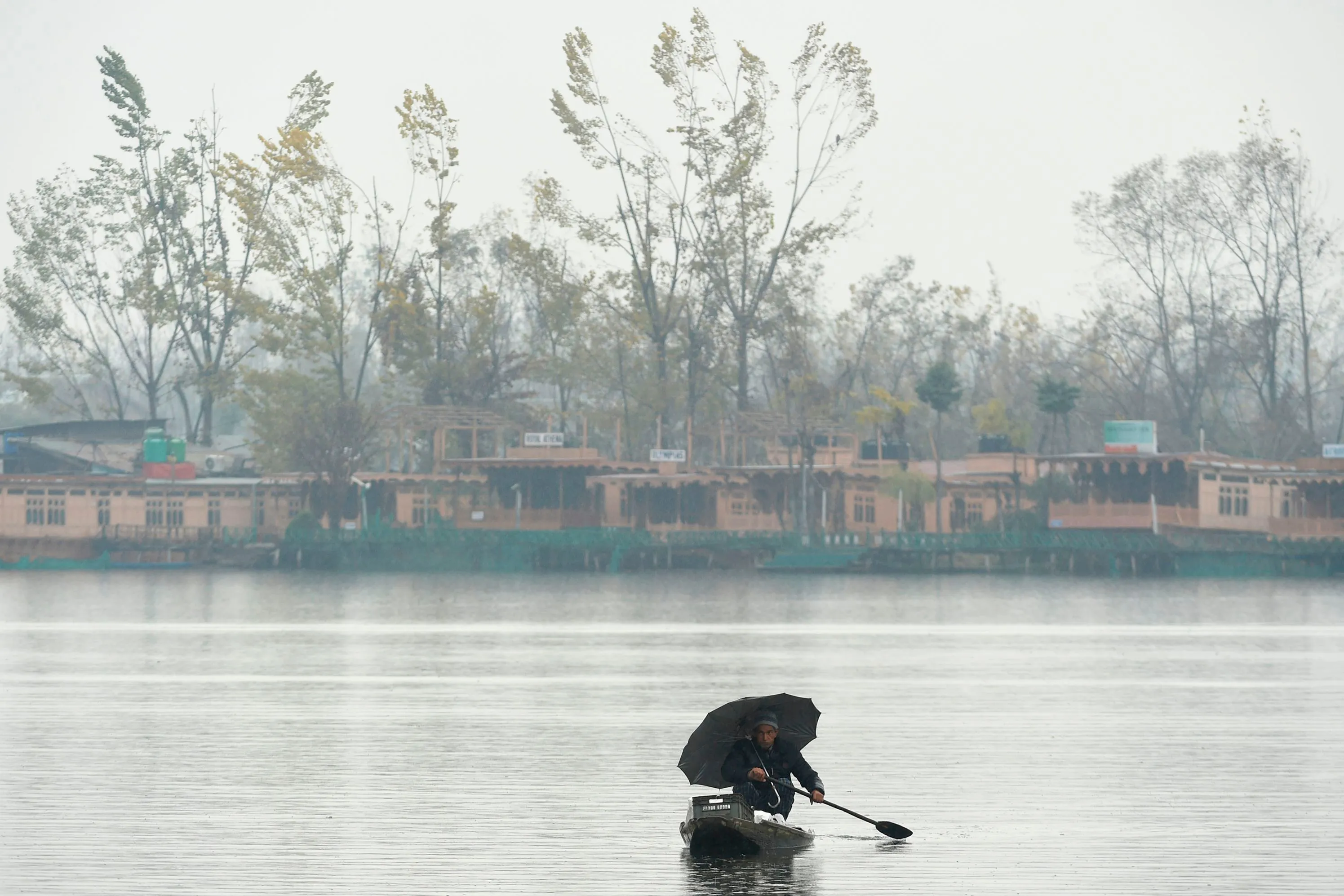 A Kashmiri man rows a boat in the waters of Dal Lake as it rains in Srinagar on November 22, 2019. (Photo by Tauseef Mustafa/AFP Photo)