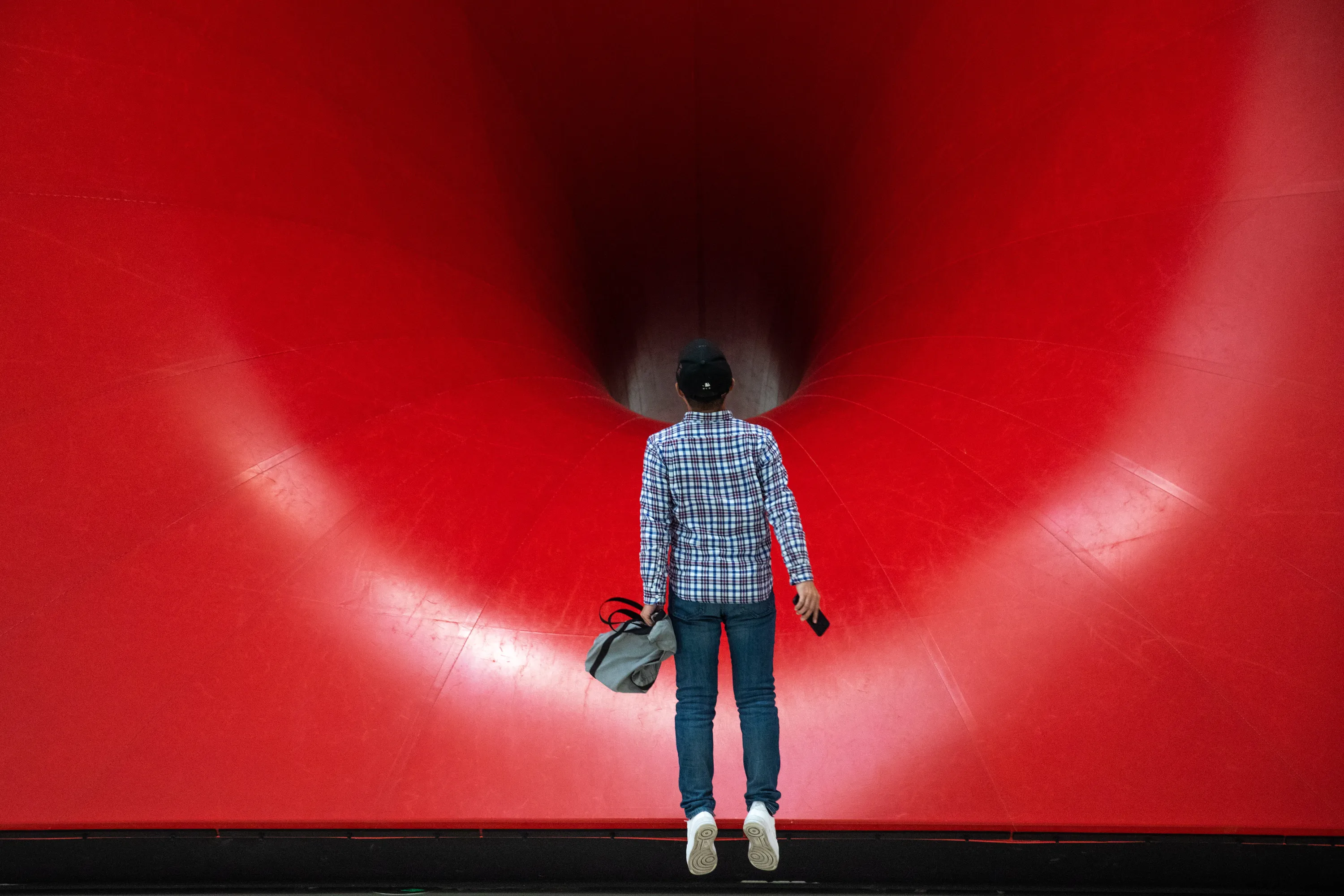 A visitor jumps to look at “Sectional Body preparing for Monadic Singularity” artwork during an exhibition of British-Indian artist Anish Kapoor, at the CAFA Art Museum, in Beijing, China, 19 November 2019. The first solo museum show in China for Anish Kapoor presents his most significant works and runs until 01 January 2020. (Photo by Roman Pilipey/EPA/EFE)