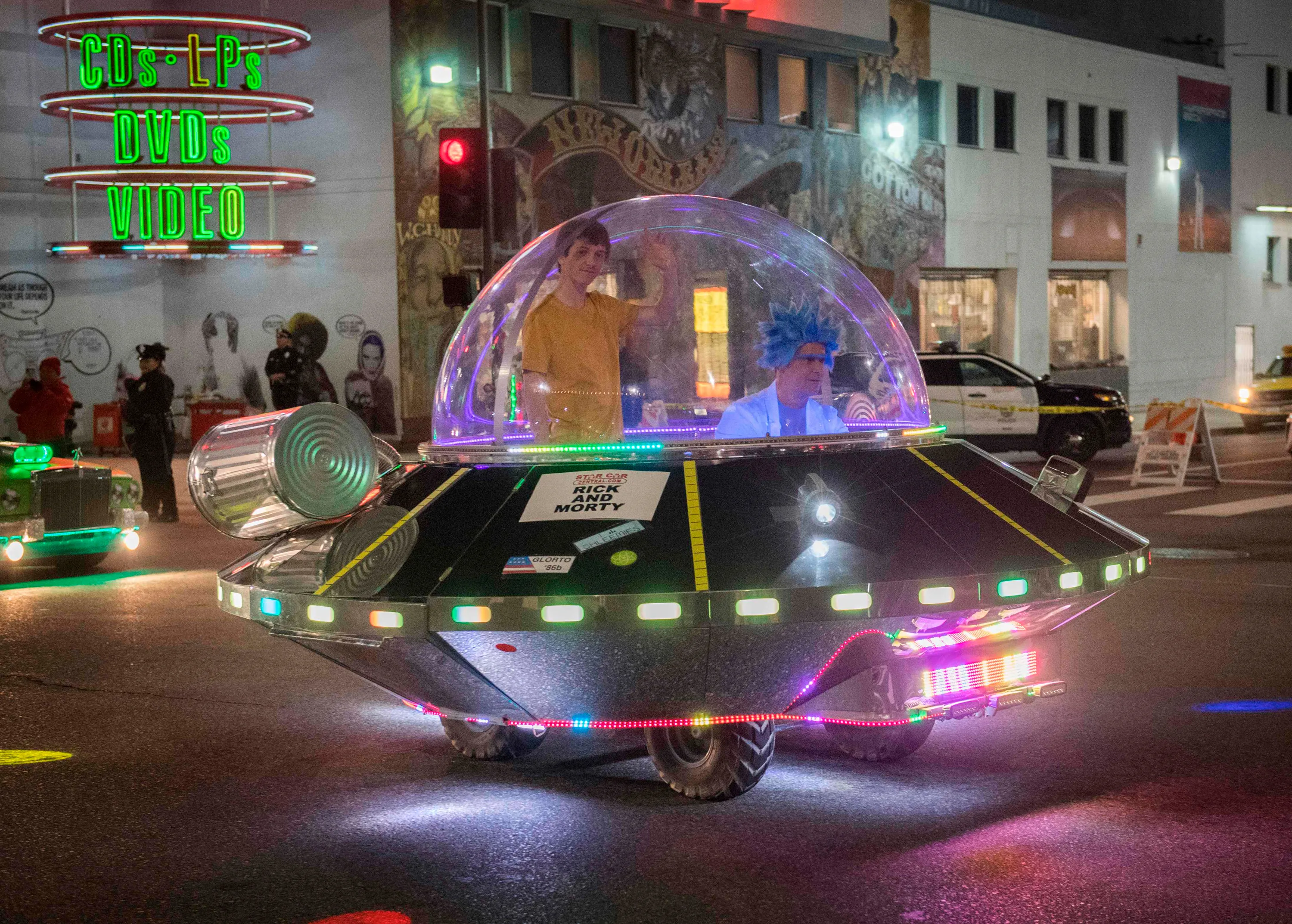 People dressed as characters from animated sitcom “Rick and Morty” ride down Sunset Blvd during the 88th annual Hollywood Christmas Parade in Hollywood, California on December 1, 2019. (Photo by Mark Ralston/AFP Photo)